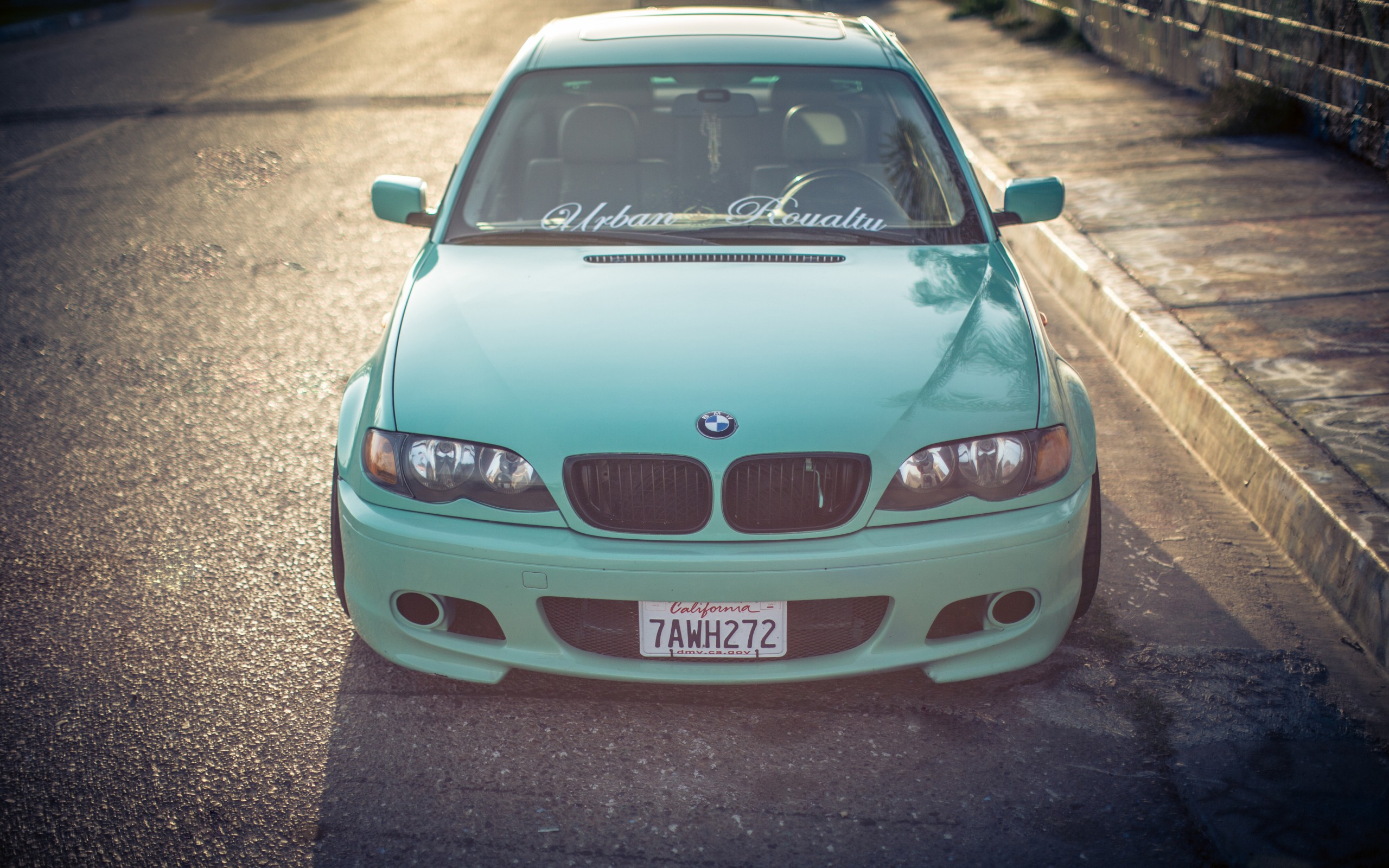 Description: A blue car parked on the side of the road with a license plate on it's hood and front grill.
