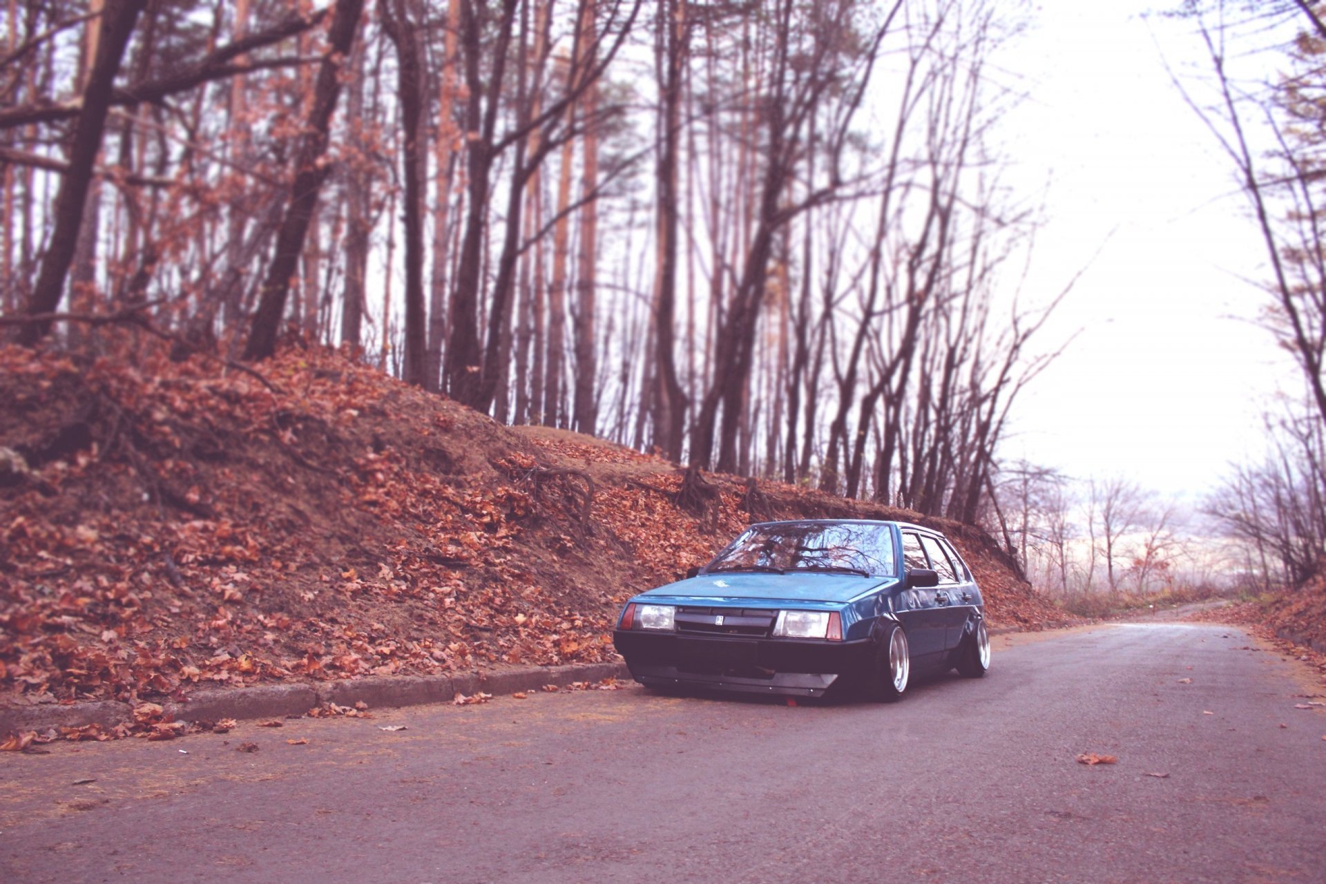 Description: A blue car parked on the side of a road next to a hill of leaves and trees with a sky background.