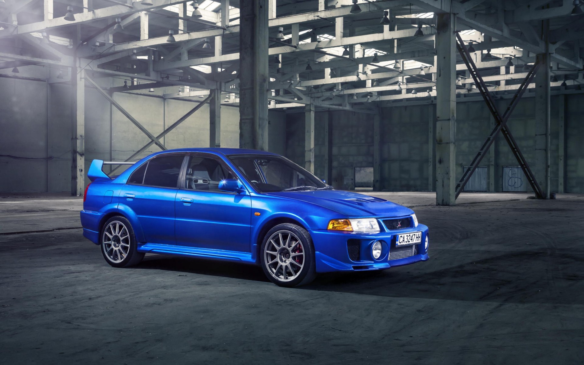 Description: A blue car parked in a parking garage next to a building with a lot of windows and a light.