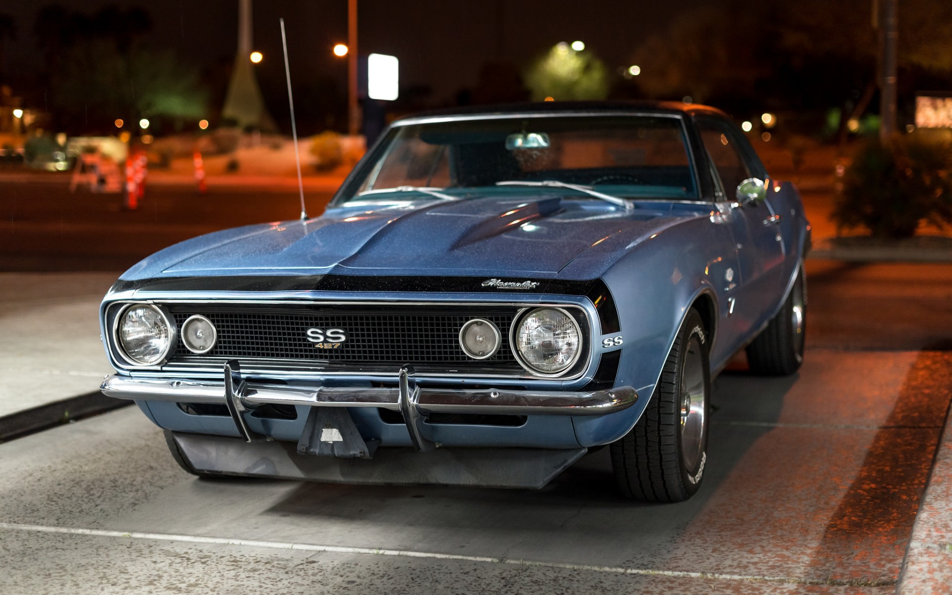 Description: A blue car parked in a parking lot at night time with a person walking by it and a person walking by it.