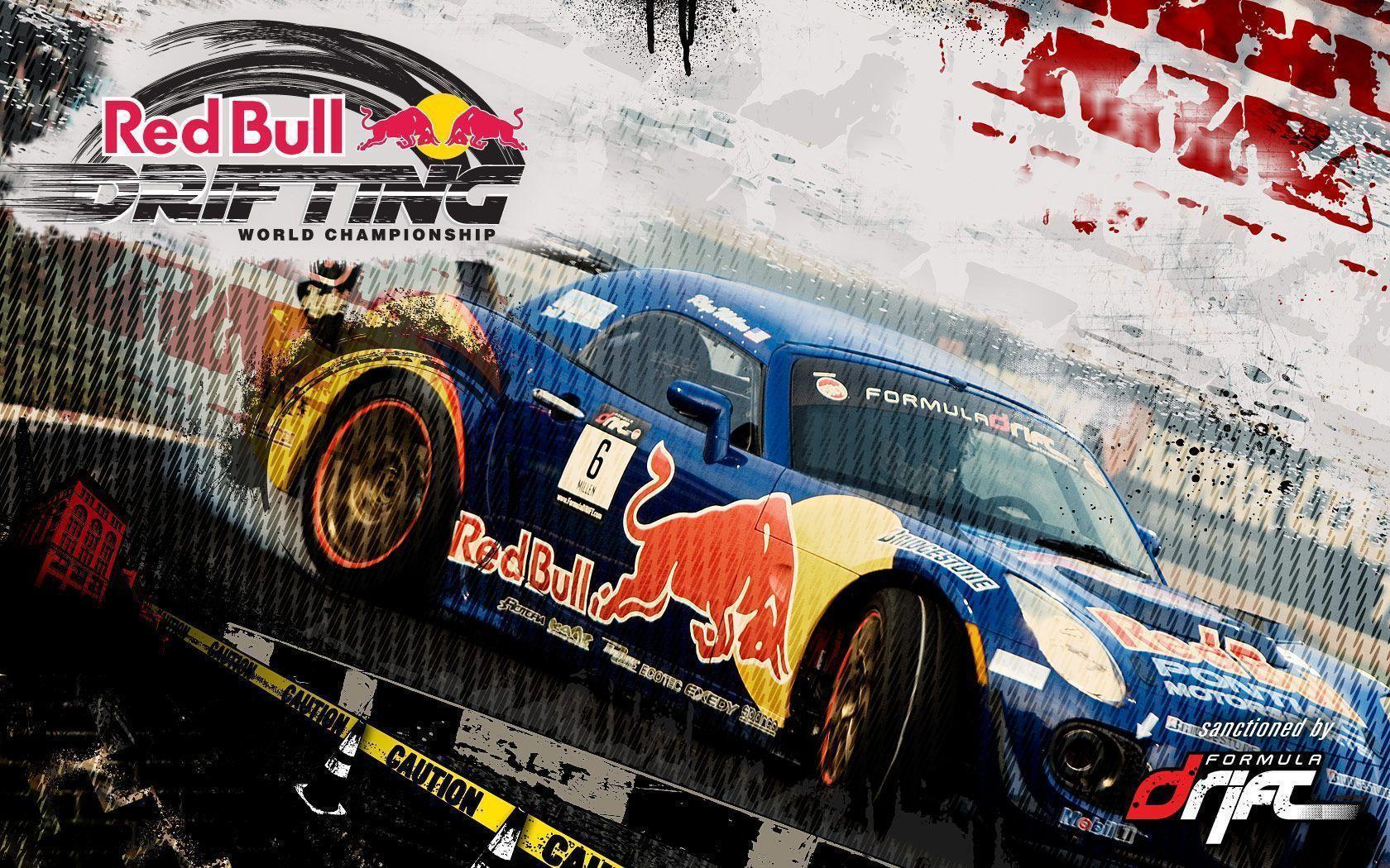 Description: A blue car with red bull racing on it's side on a trailer with a red bull racing logo on it.