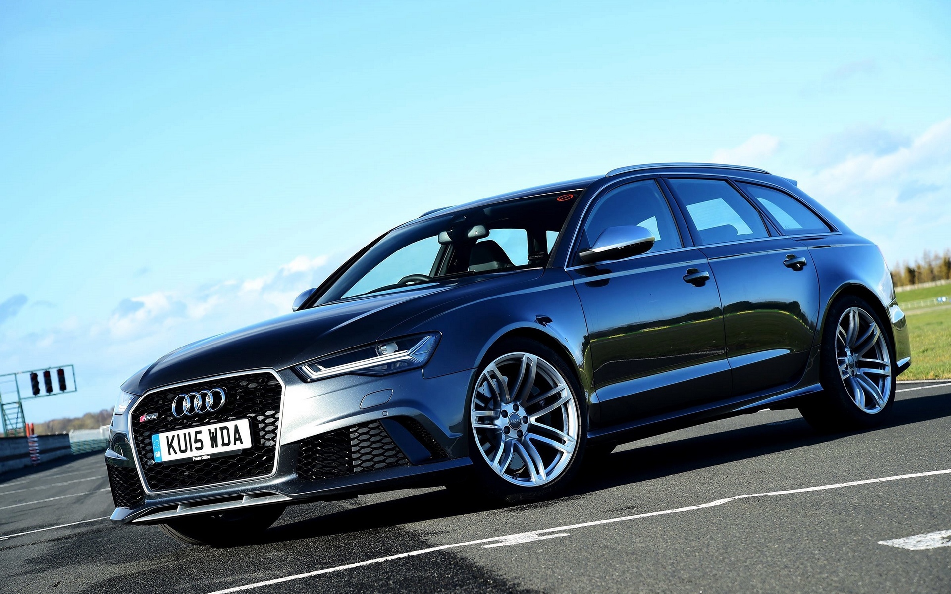 Description: A blue car parked on the side of a road next to a field of grass and trees with a sky background.