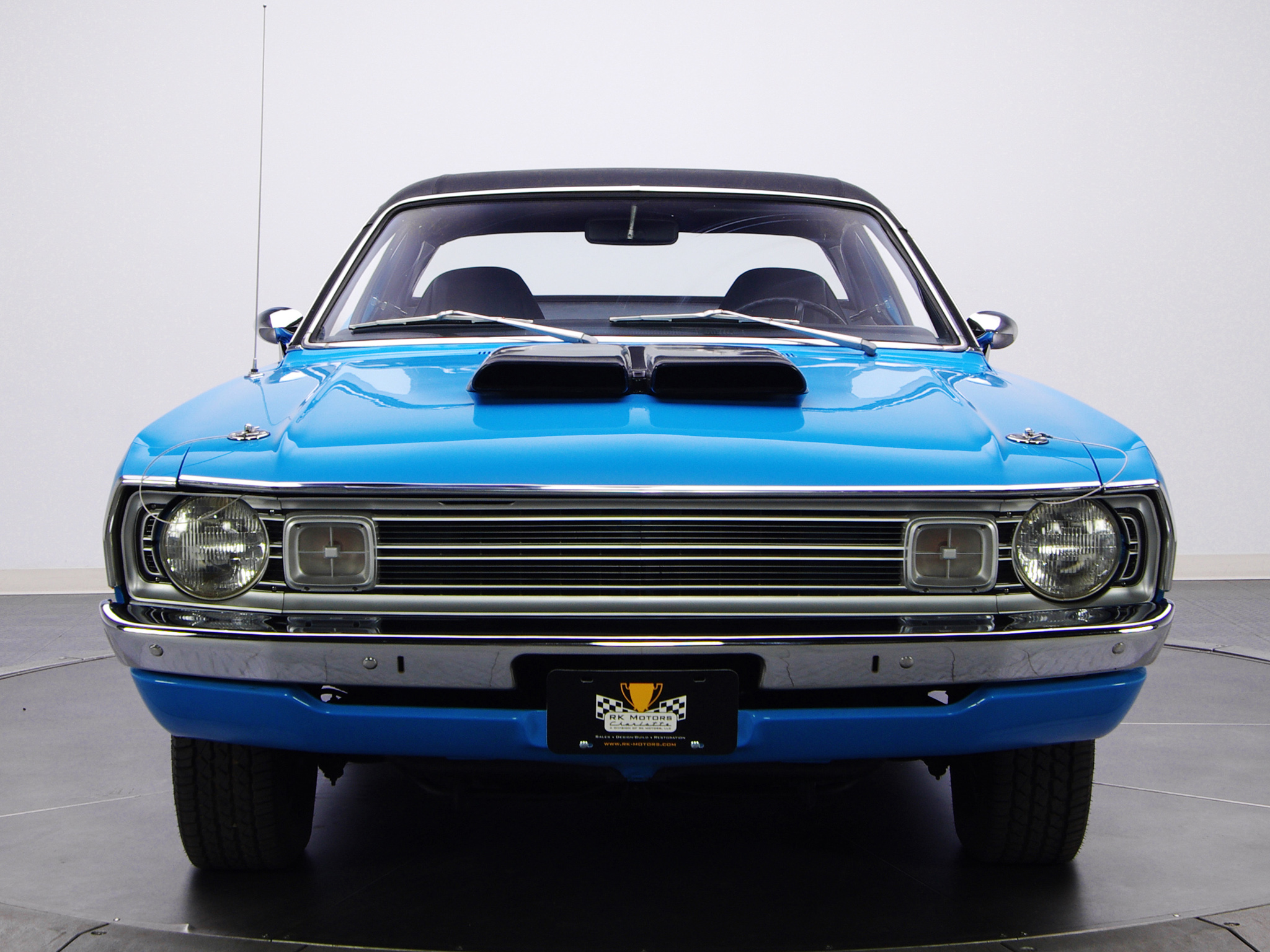 Description: A blue car is parked in a room with a white wall and a black floor and a black and white sign.