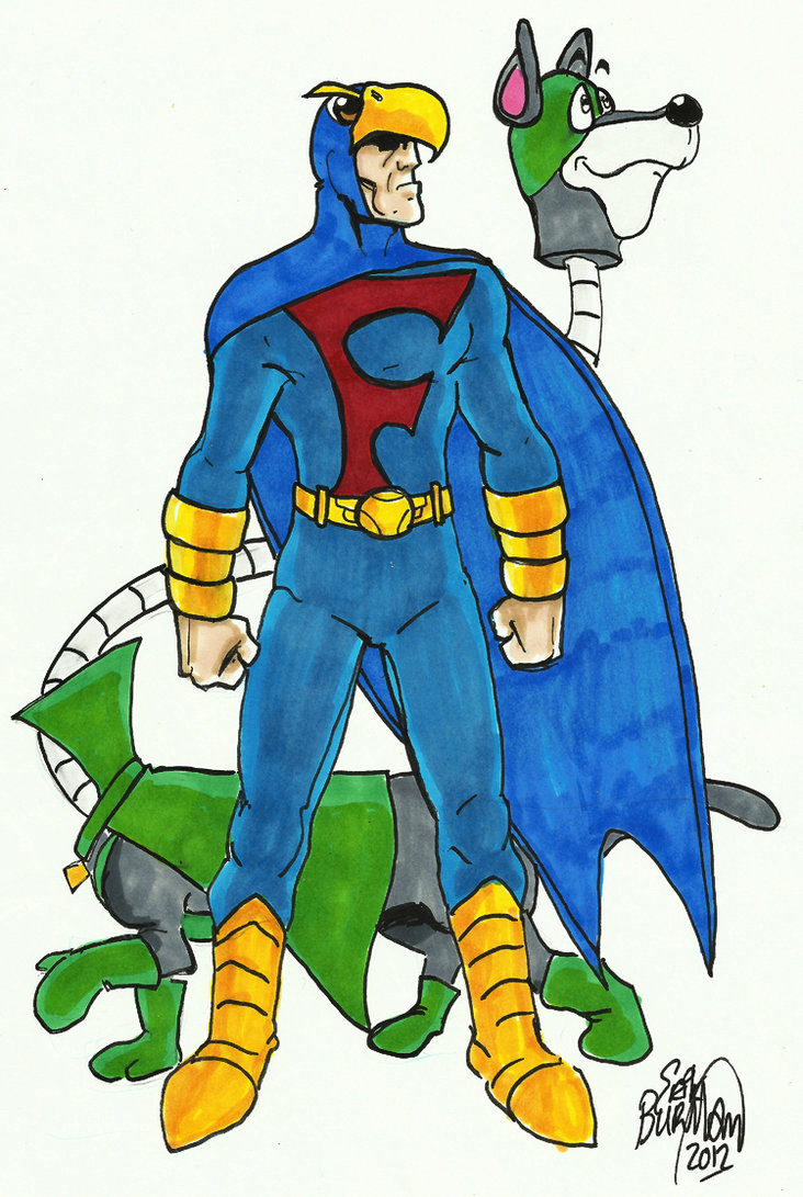 Description: A drawing of a man in a blue costume and a dog in a yellow hat and a green and yellow mask.