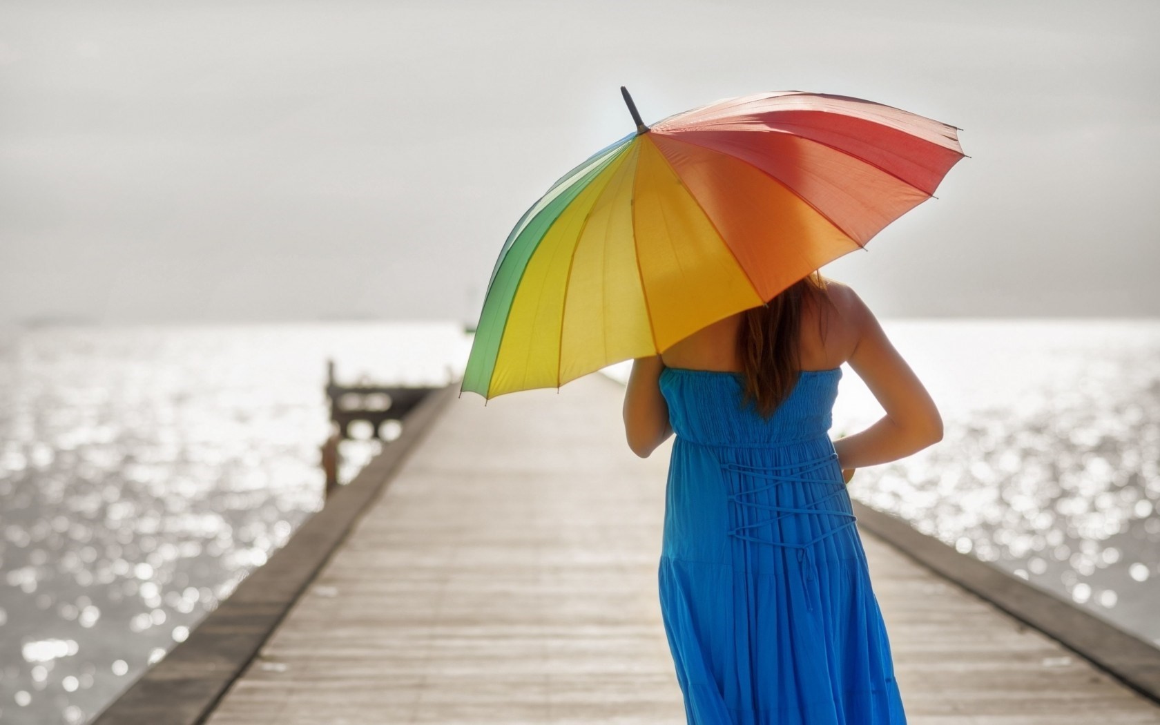 Description: A woman in a blue dress holding an umbrella on a pier near the ocean with the sun shining on the water.
