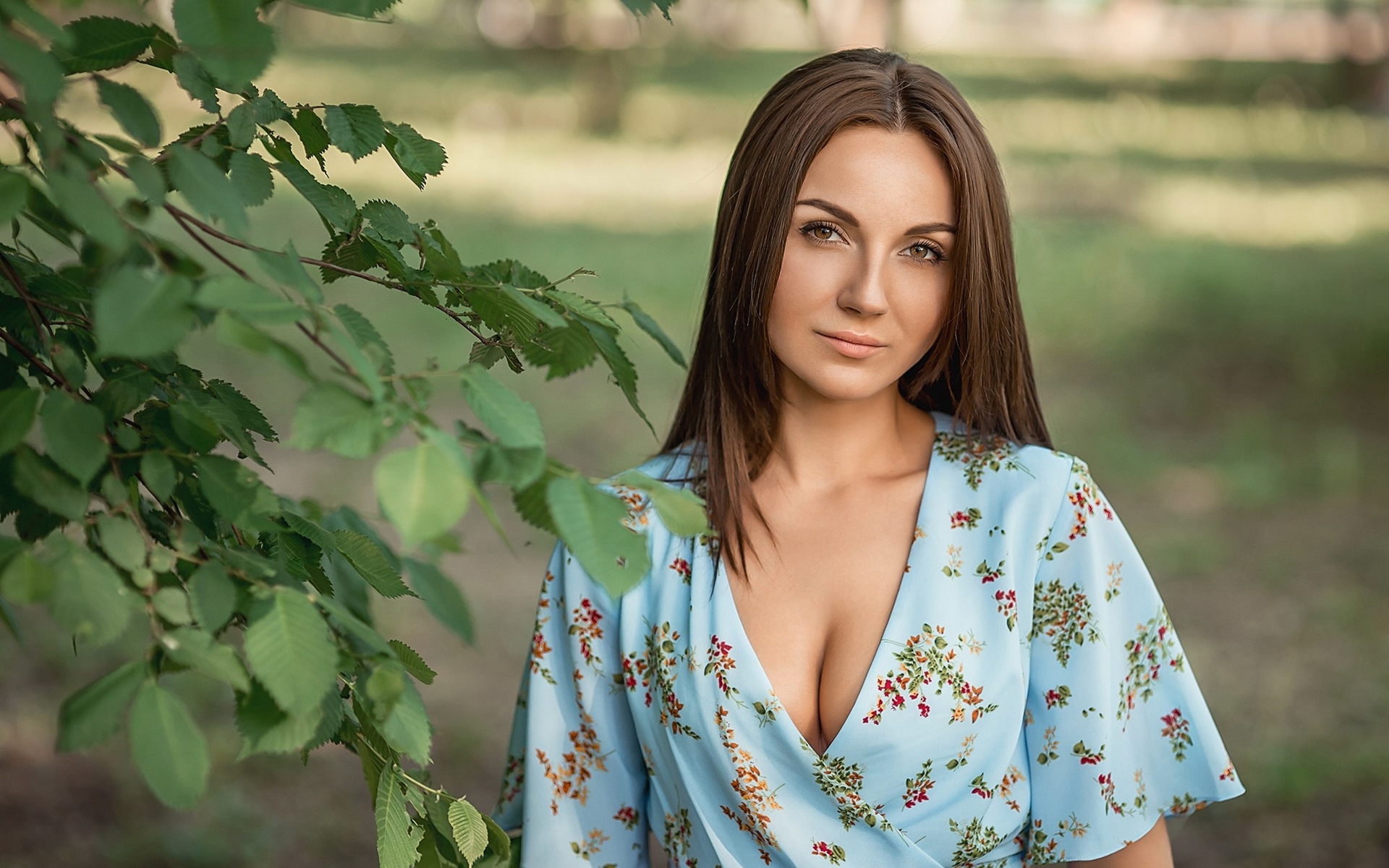 Description: A woman in a blue dress standing under a tree branch in a park with a green background and a green leafy tree.