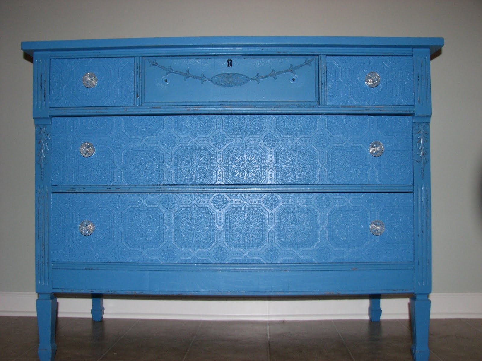 Description: A blue dresser with a clock on top of it and a clock on the wall behind it and a clock on the wall.