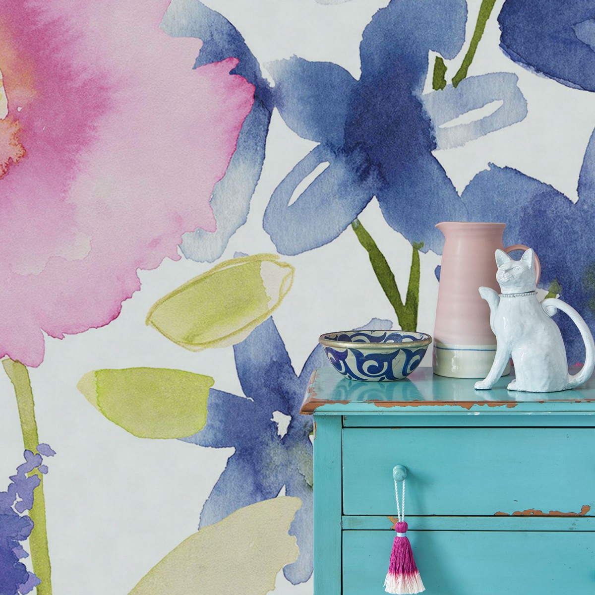 Description: A blue dresser with a vase and a cat on top of it next to a flower wallpapered wall.
