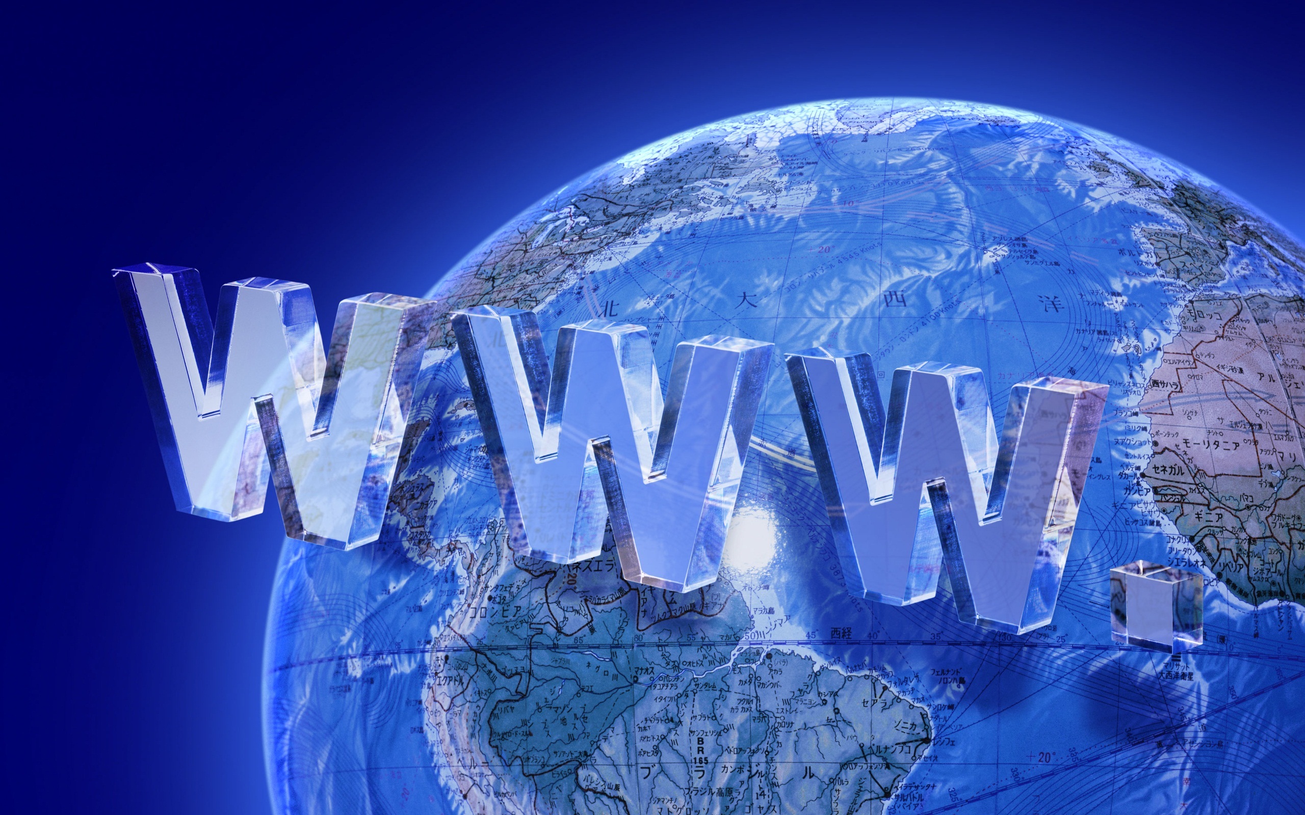 Description: A blue earth with the word wwww spelled out in letters on it's side and a blue background.