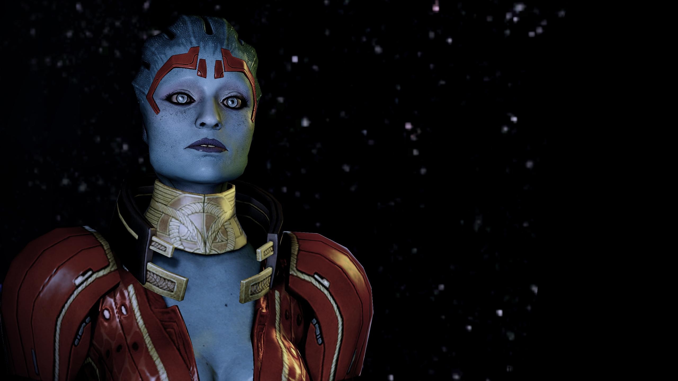 Description: A woman in a costume with a blue face and red hair and a red collar and gold accents stands in front of a black background.