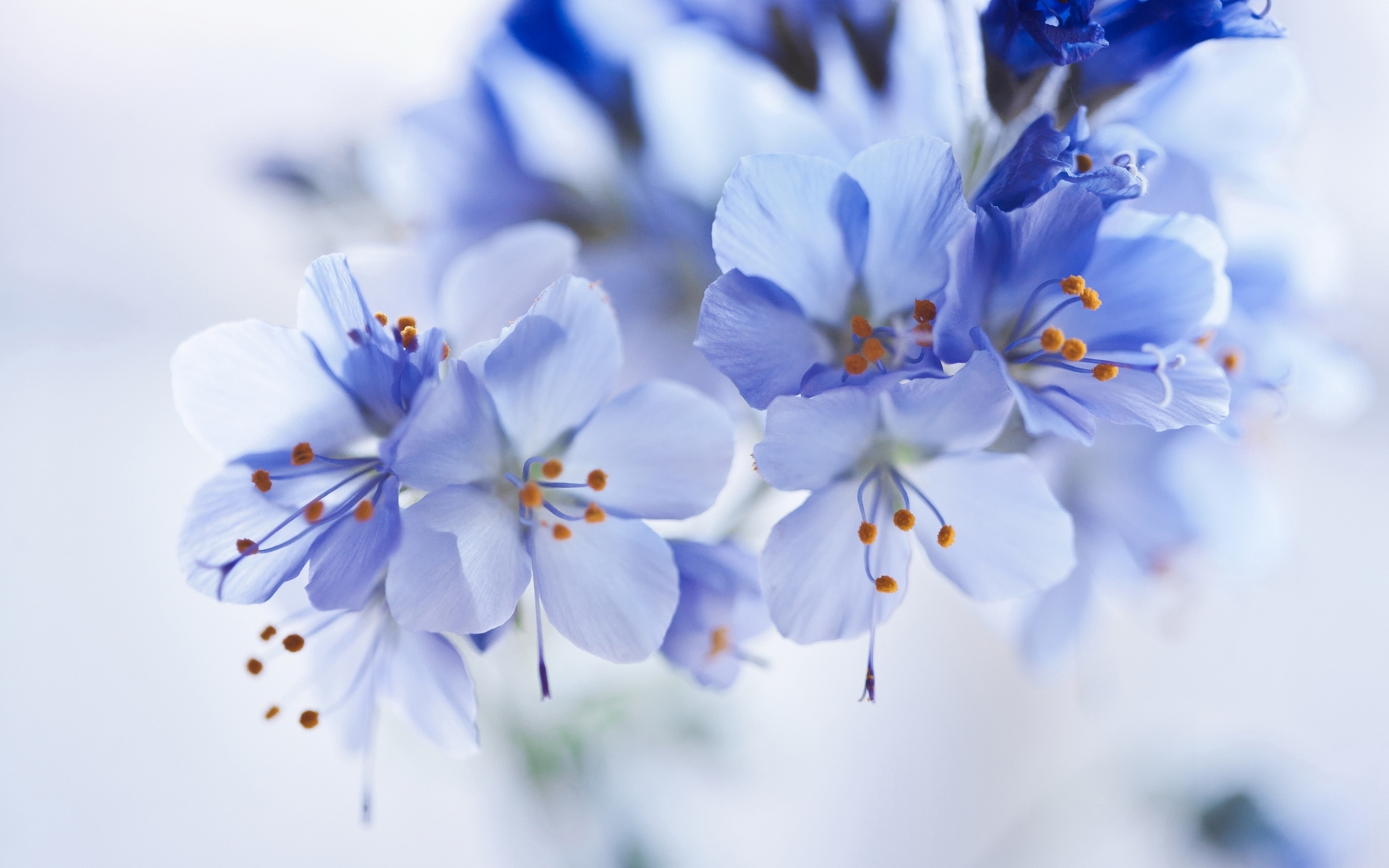 Description: A close up of a bunch of blue flowers in a vase with water in it and a blurry background.