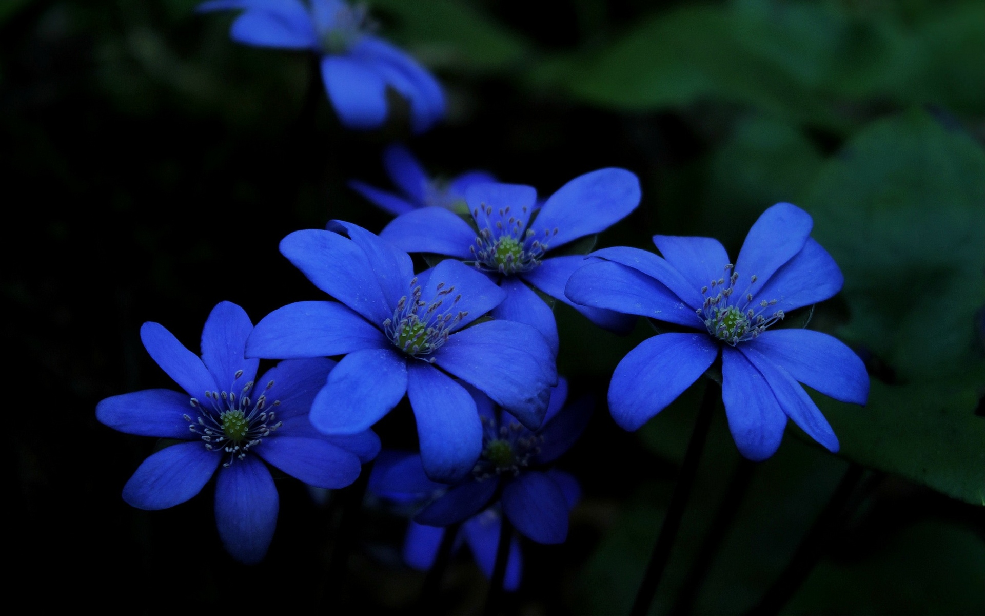 Description: A group of blue flowers with green leaves in the background and a dark background with a green leafy area.