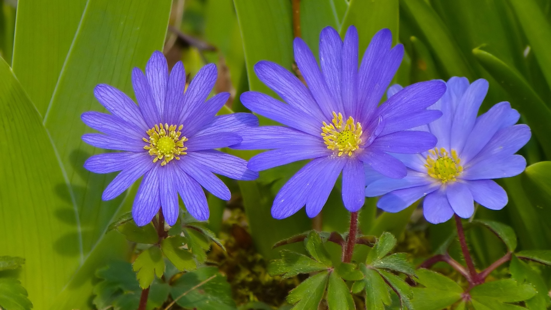 Description: Two blue flowers are in the grass near some green leaves and grass.