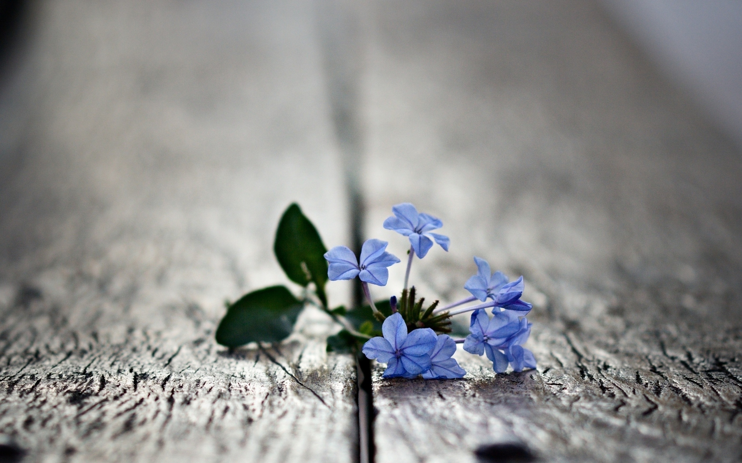 Description: A small blue flower is on a wooden surface with a green stem and leaves on it.