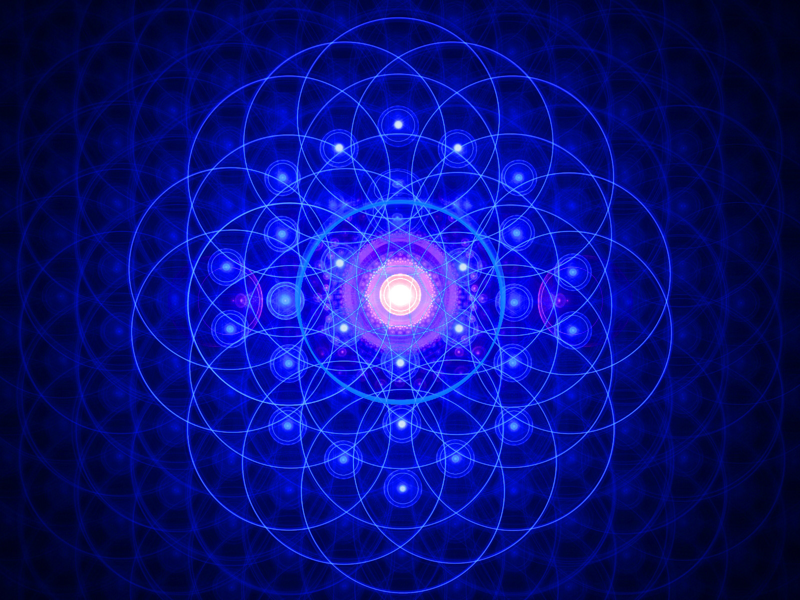 Description: A blue flower with a red center surrounded by smaller circles of light and a black background with a blue center.