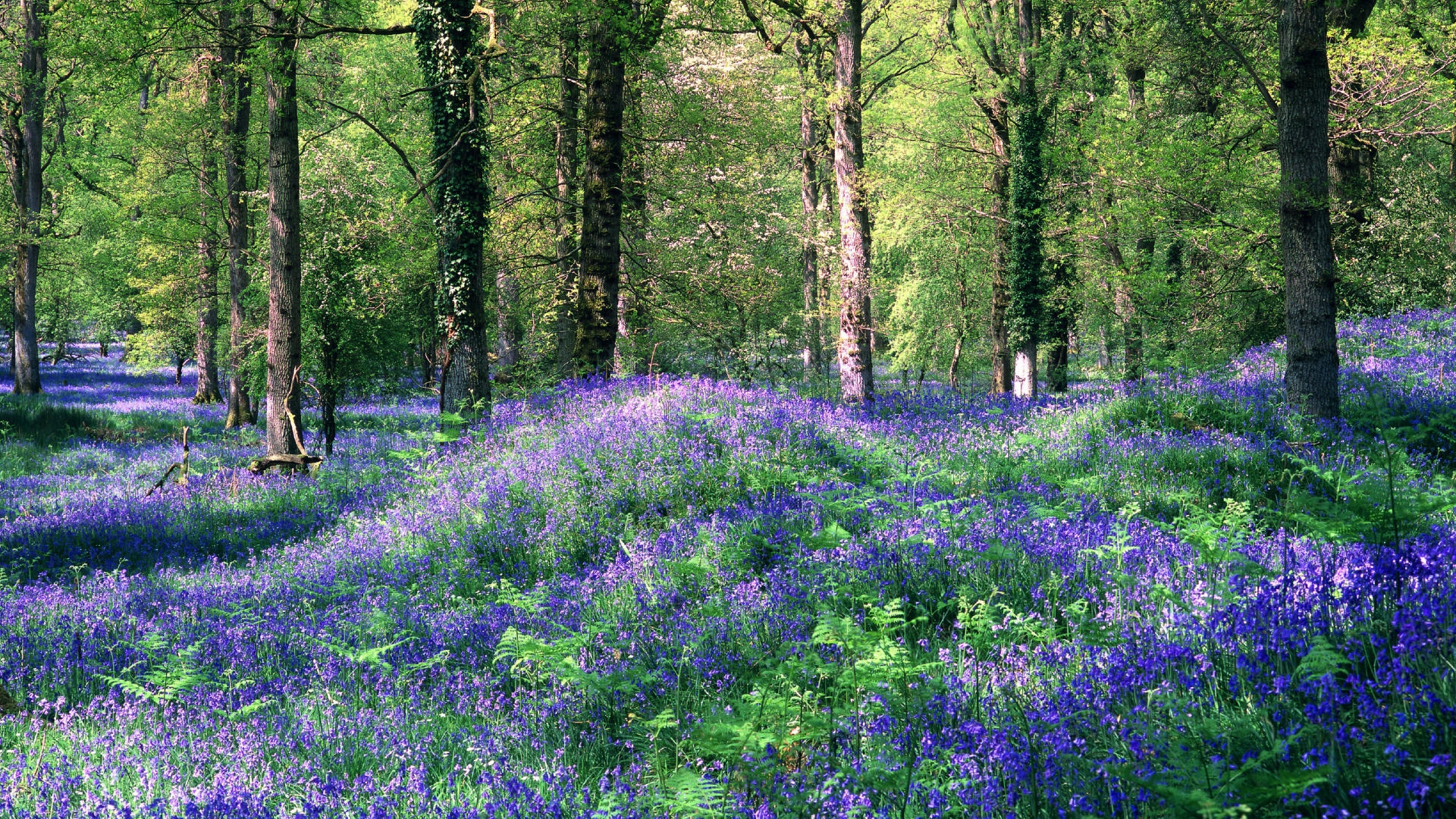 Description: A forest filled with lots of blue flowers and trees in the middle of it's forest of blue flowers.