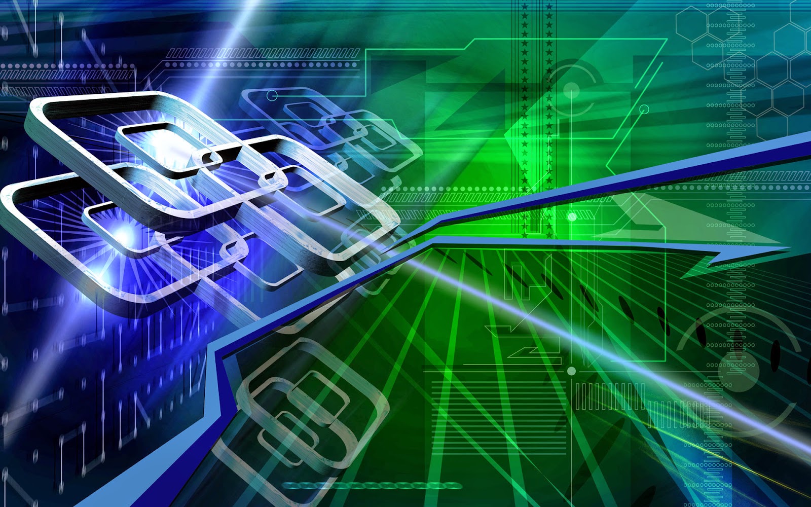 Description: A blue and green abstract background with a large letter e on it's side and a smaller letter e on the bottom.