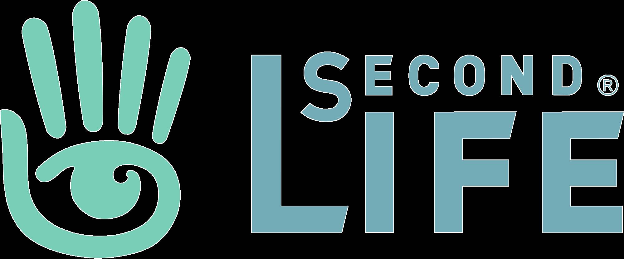 Description: A blue and green sign that says second life with a hand in the middle of it and the words second life.