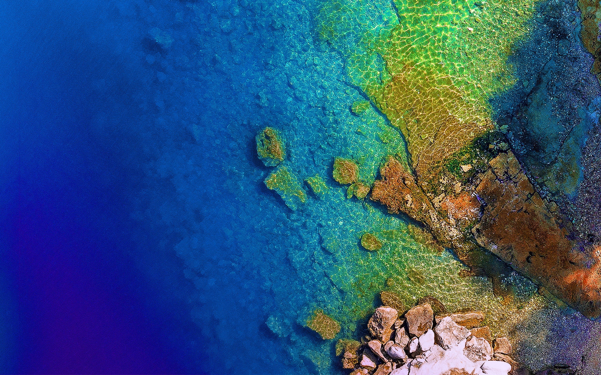 Description: A blue and green water with rocks and rocks in it and a rock outcropping in the middle.