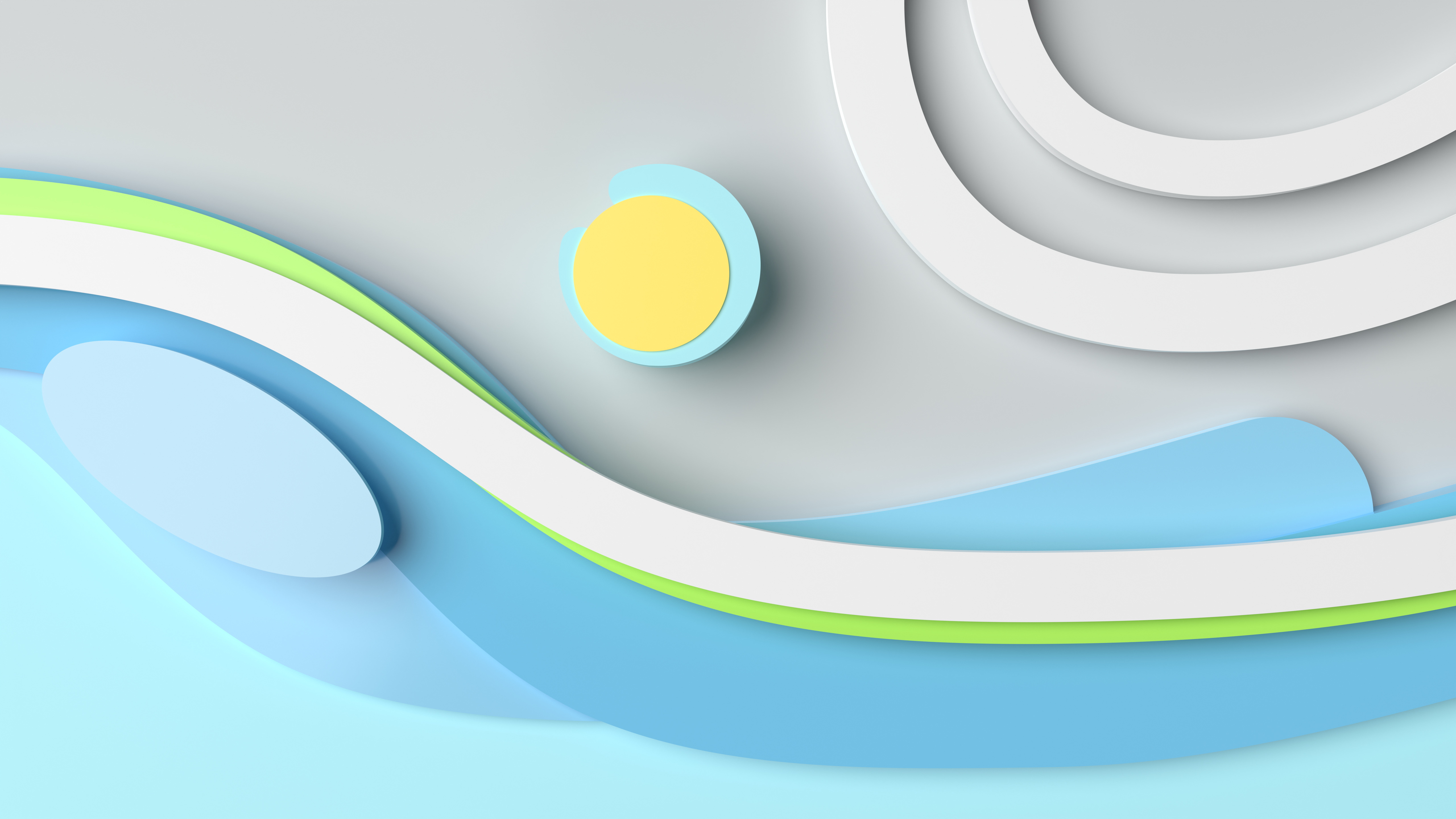 Description: A blue and green abstract background with a yellow ball in the middle of it and a white and green curved design.