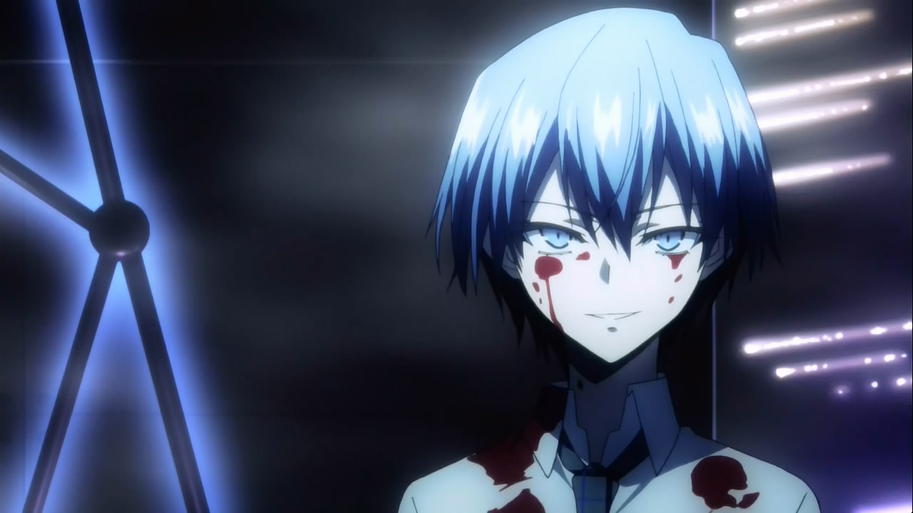 Description: A person with blue hair and a bloody face standing in front of a windmill with a bloody face on it.