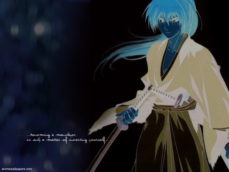 Description: A woman with blue hair holding a sword and a sword in her hand.