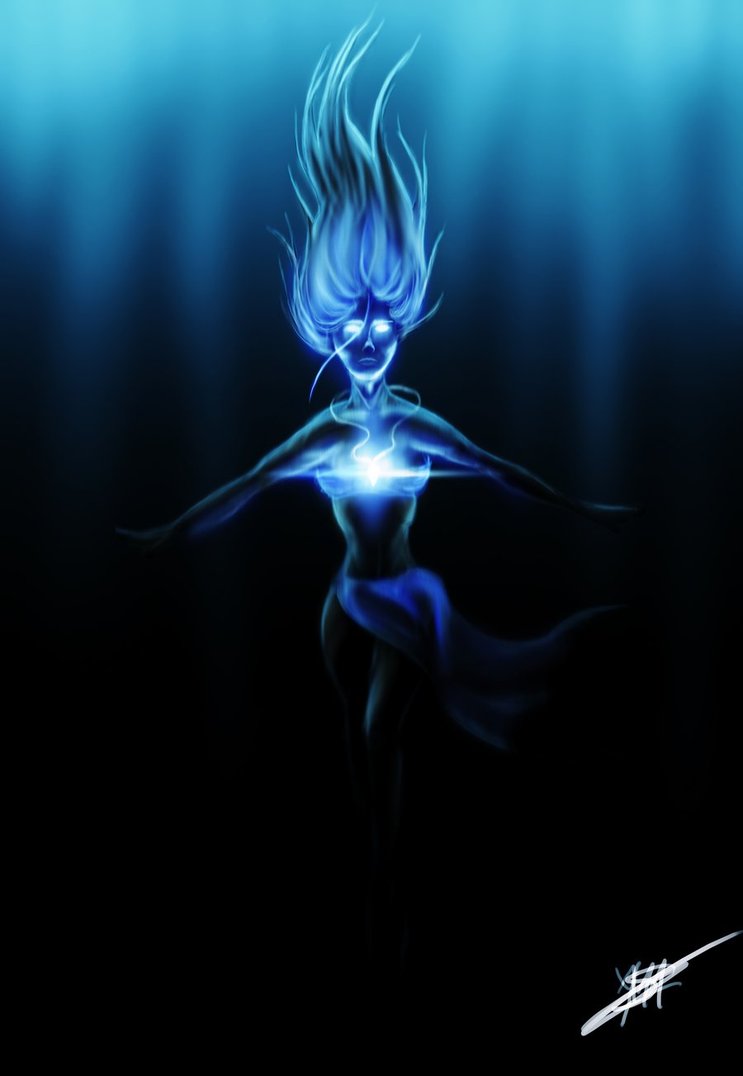 Description: A woman with blue hair and a body of water in the background is a blue light and a white star.