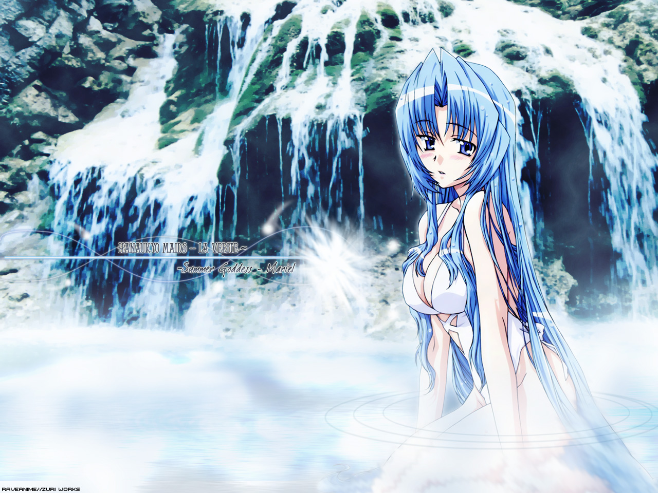 Description: A woman with blue hair standing in front of a waterfall with water casing from it's sides.