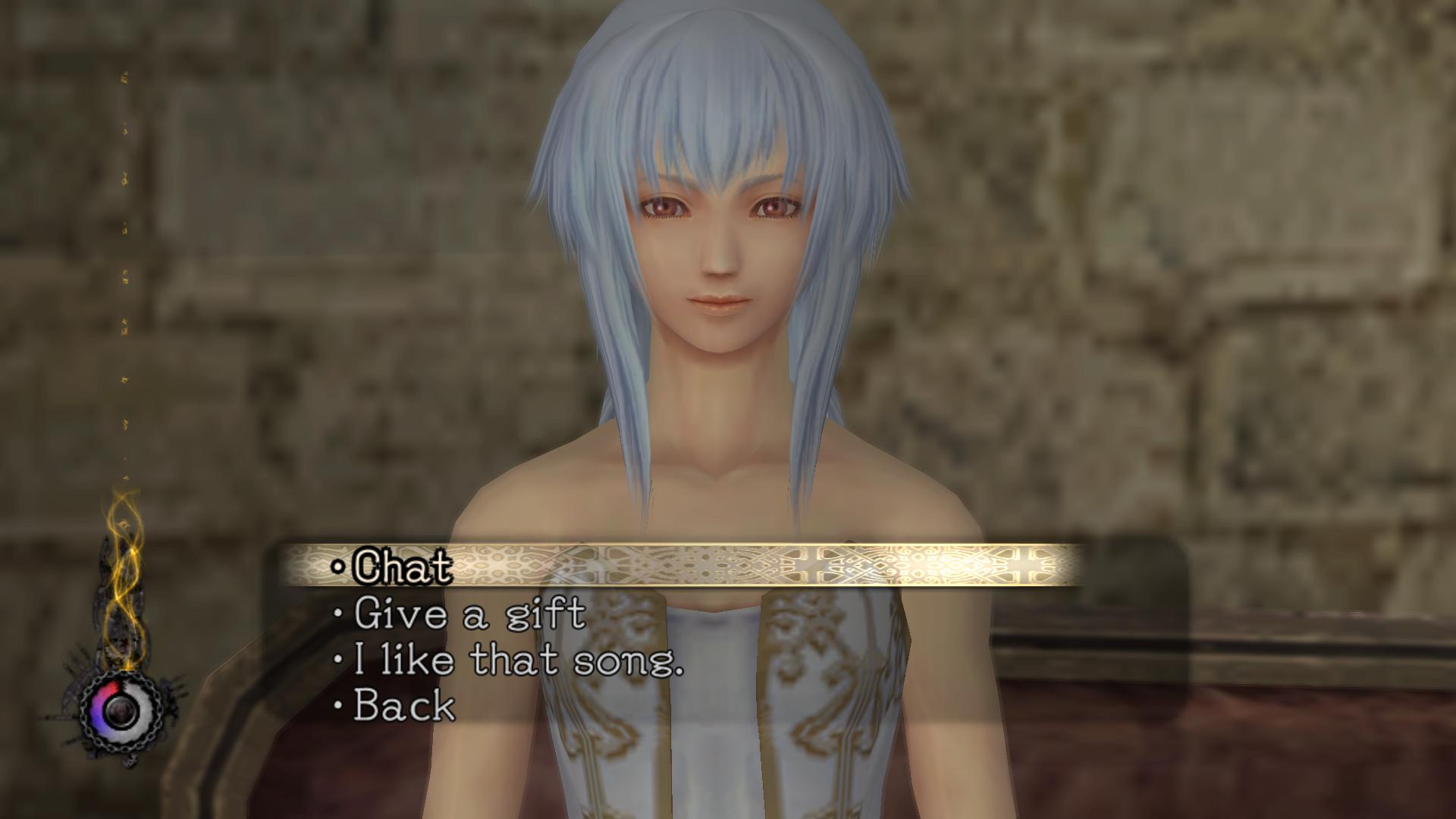 Description: A video game character with blue hair and a white dress on a screen with a caption that reads.