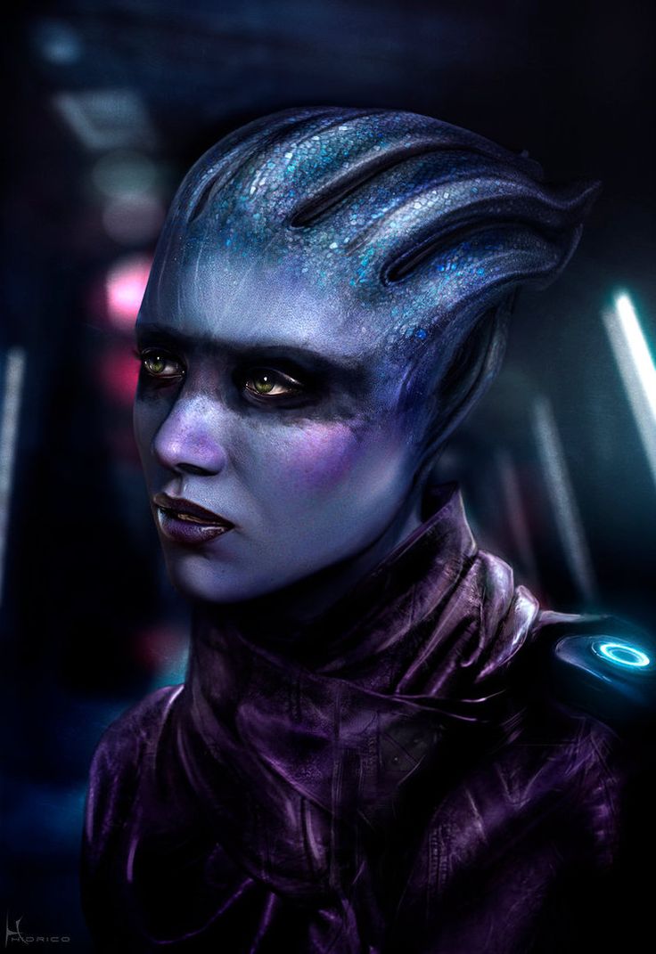 Description: A woman with blue hair and a black face and blue hair and makeup is wearing a purple leather jacket.