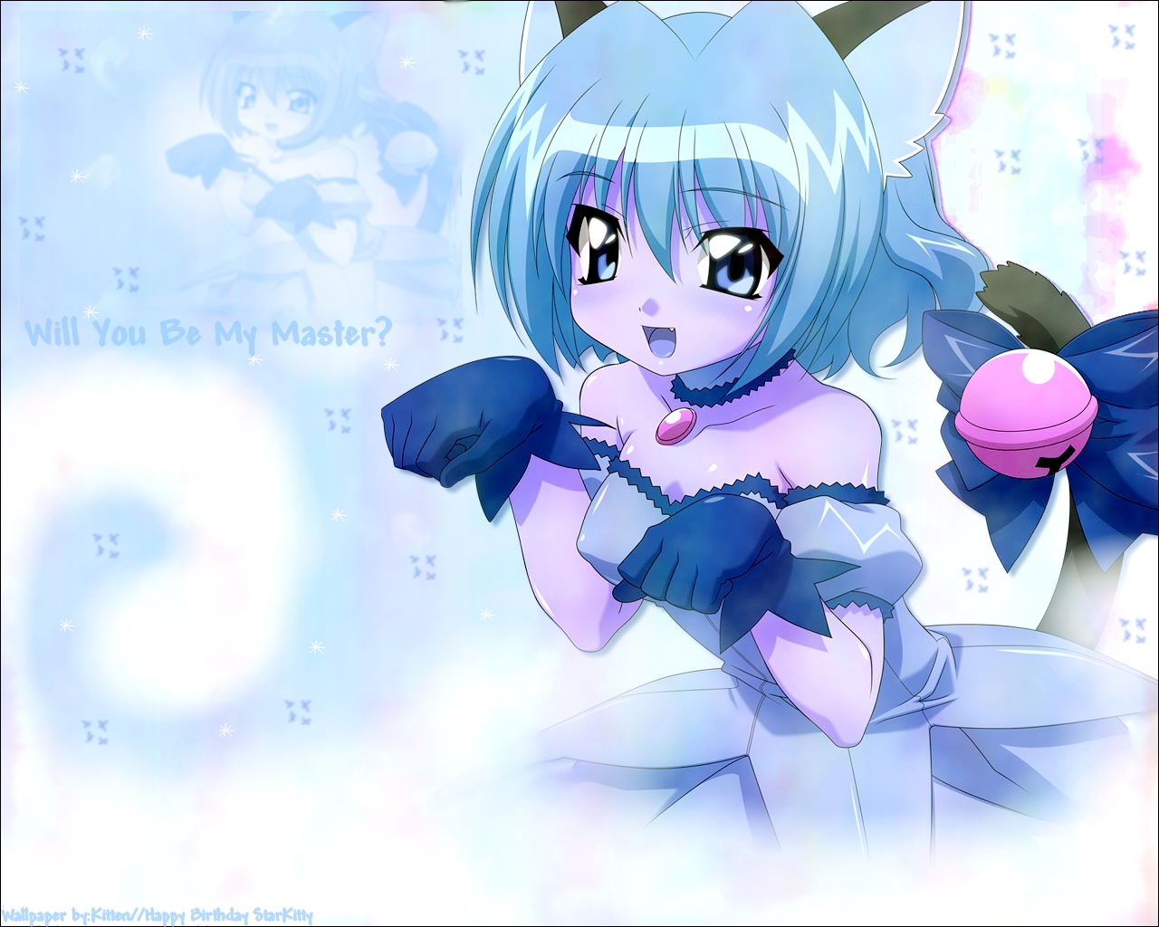 Description: A cartoon character with blue hair and a blue dress holding a pink object in her hand and a blue background.
