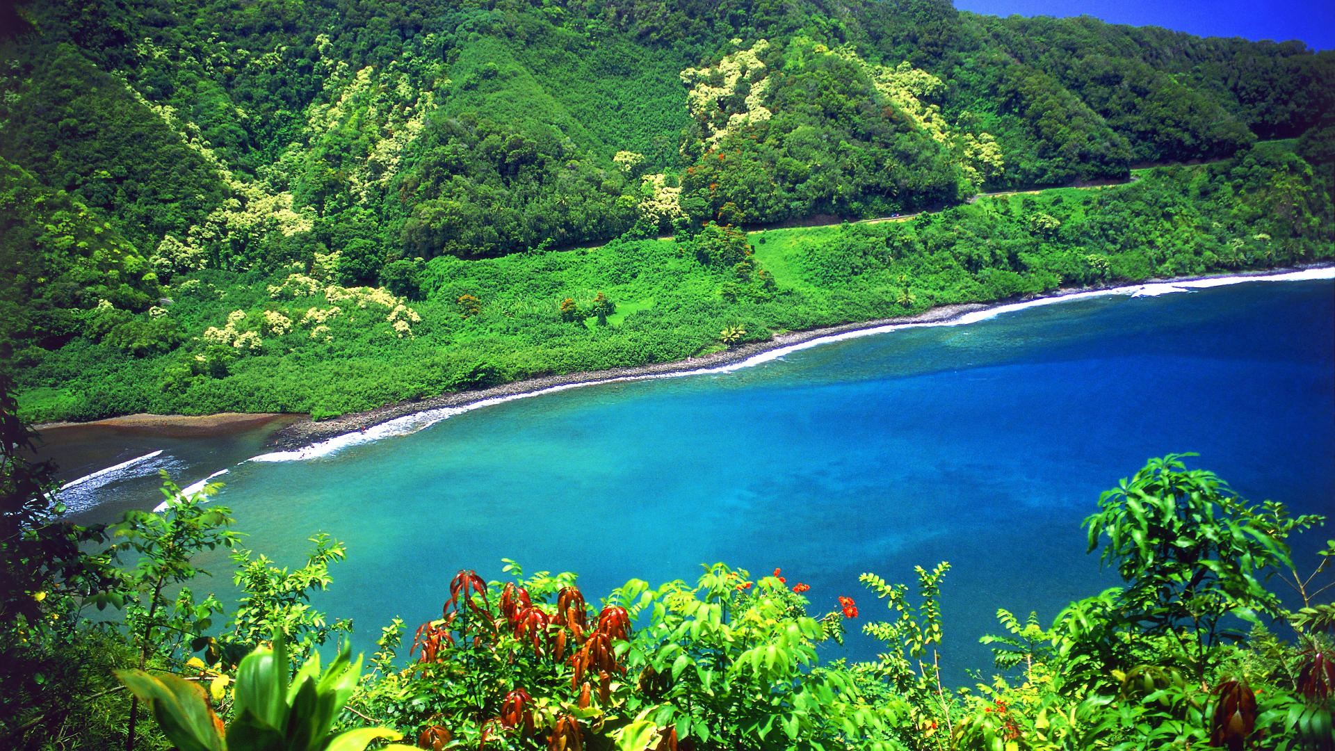 Description: A blue body of water surrounded by lush green hills and trees on a hillside side with a beach in the distance.