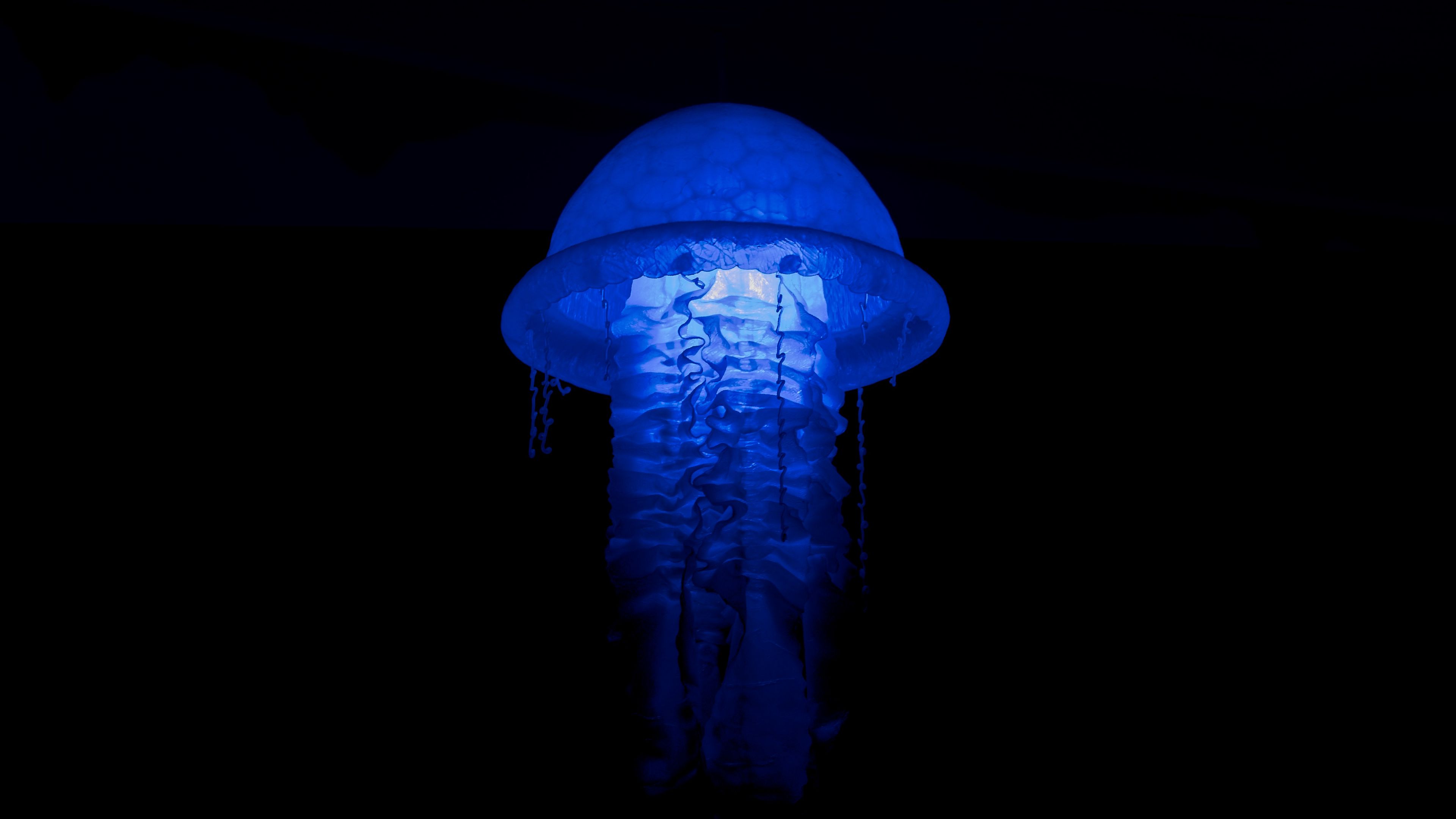 Description: A blue jellyfish in the dark with a black background and a white light on it's head.