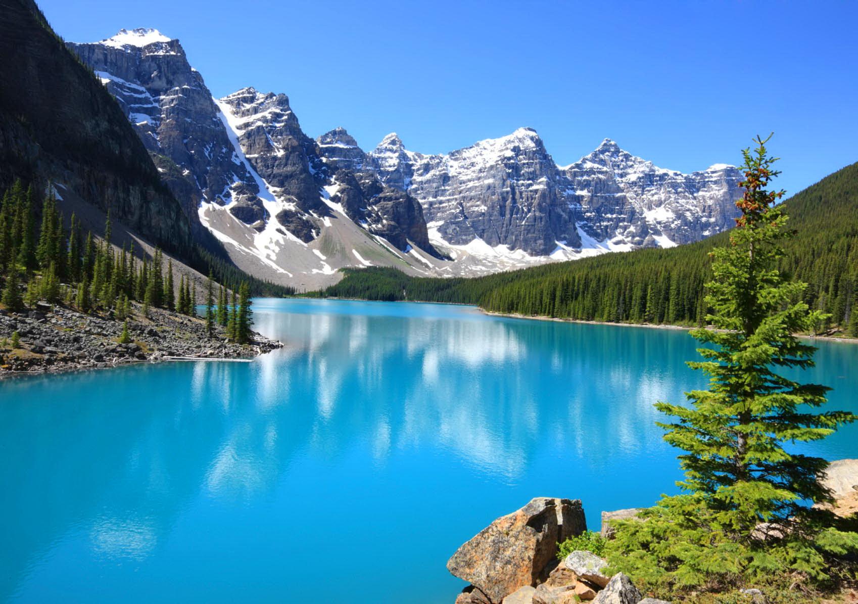 Description: A blue lake surrounded by mountains and trees in the mountains with snow on them and a blue sky with clouds.