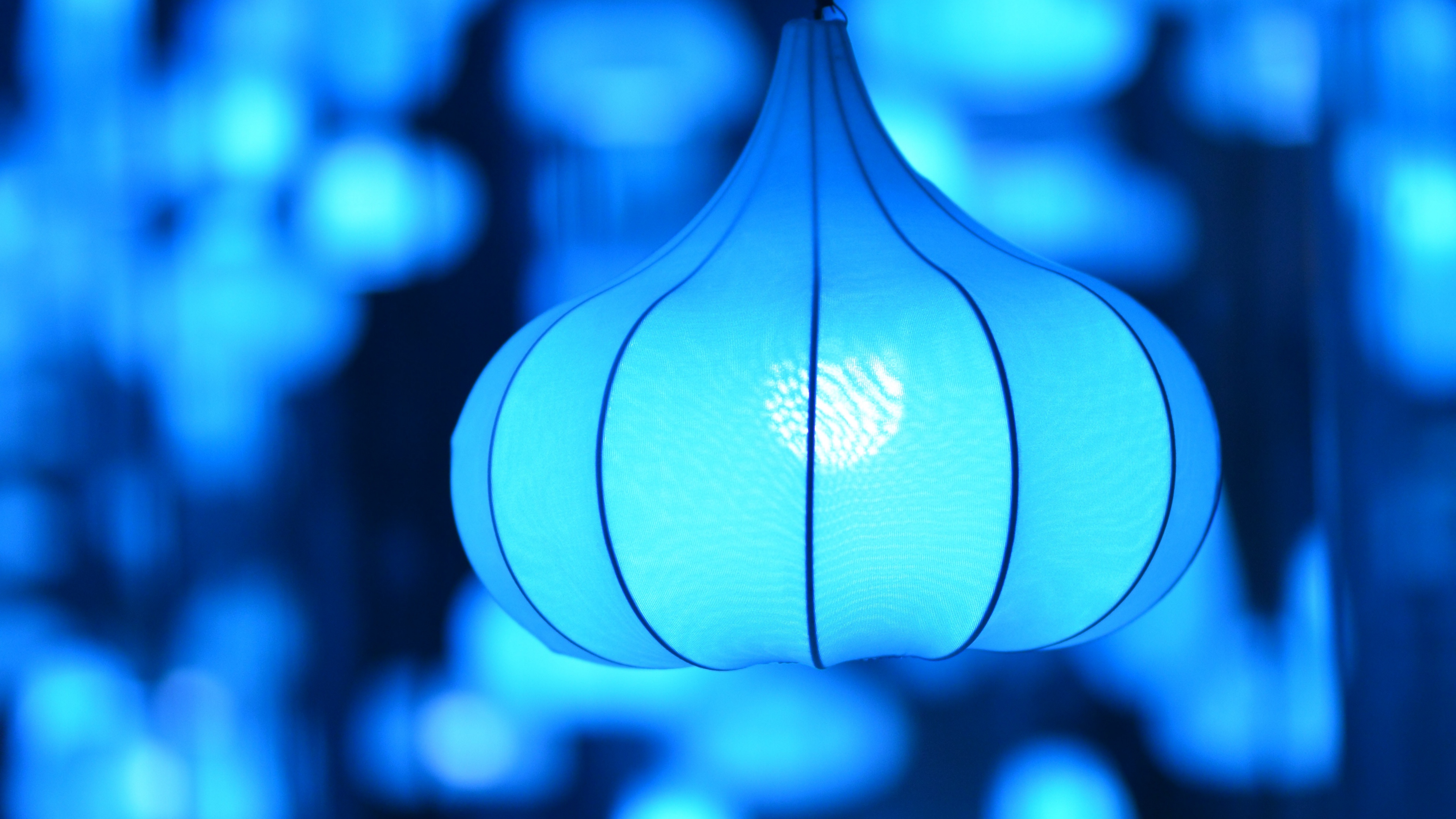 Description: A blue light hanging from a ceiling in a room with blue lights in the background and a blurry wall behind it.