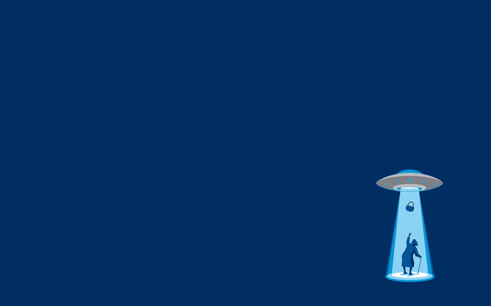 Description: A blue light tower with a man walking in it and a person walking away from it on a dark blue background.