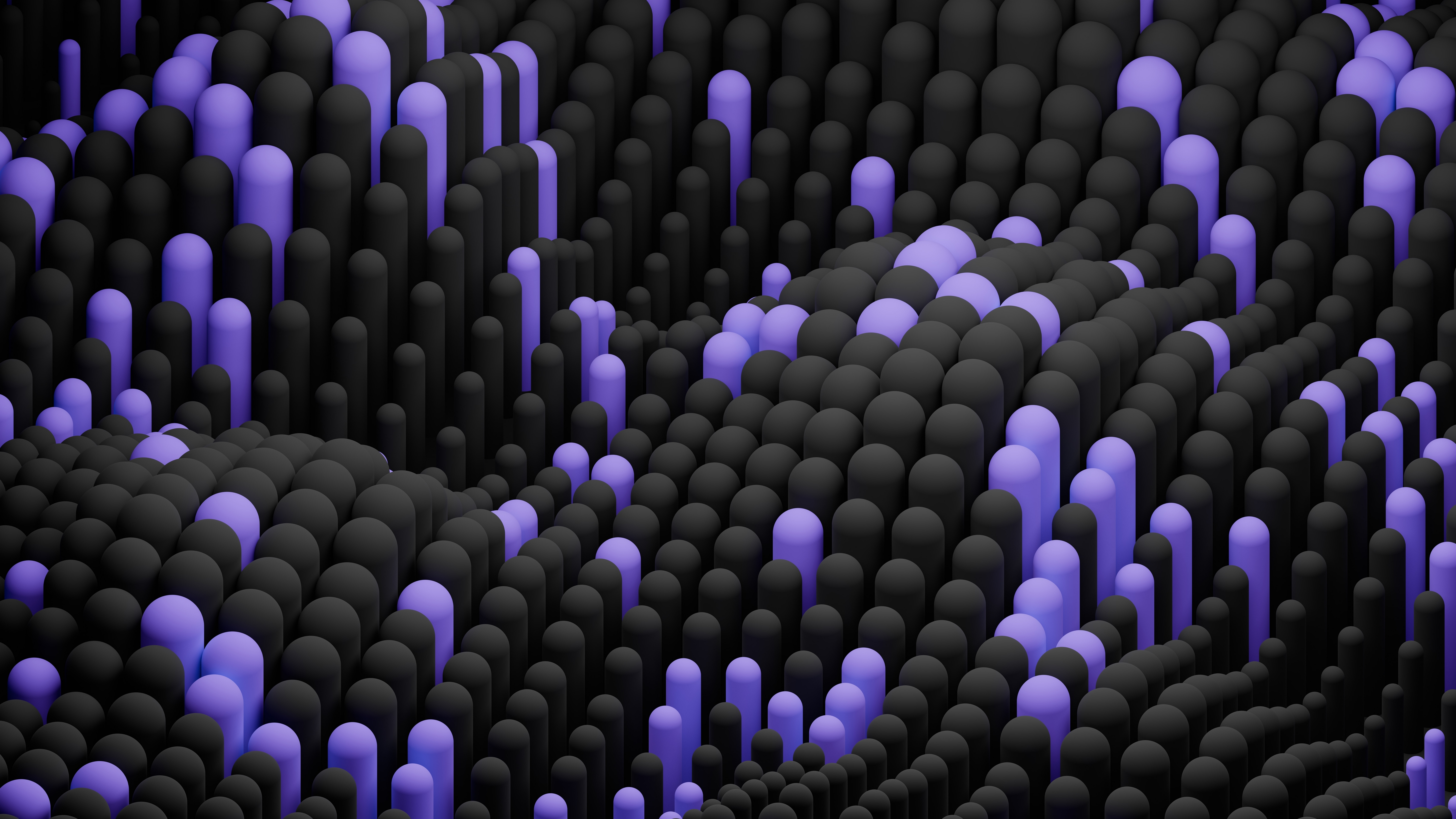Description: A large group of people with blue lights on them are in a room with black walls and black flooring.