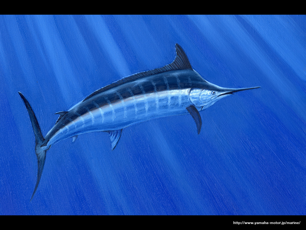 Description: A painting of a blue marlin fish in the water with sunlight streaming through the water and a fish on the side of the water.