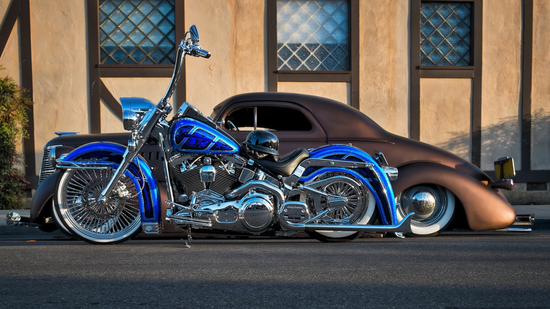 Description: A blue motorcycle parked next to a car on a street next to a building with a car in the background.
