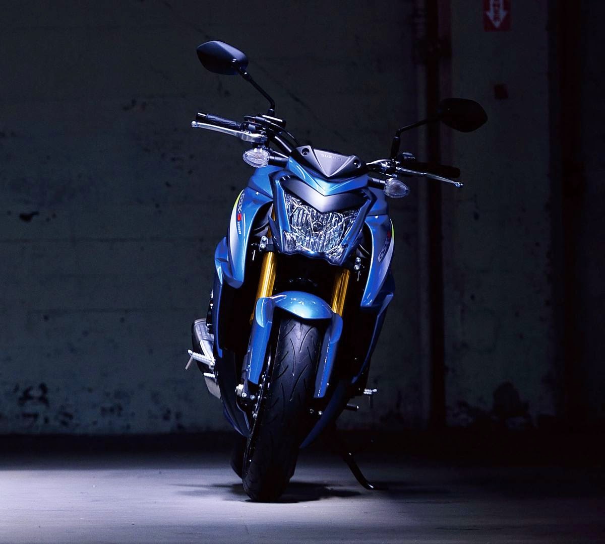 Description: A blue motorcycle parked in a dark room with a light on it's side and a black background.