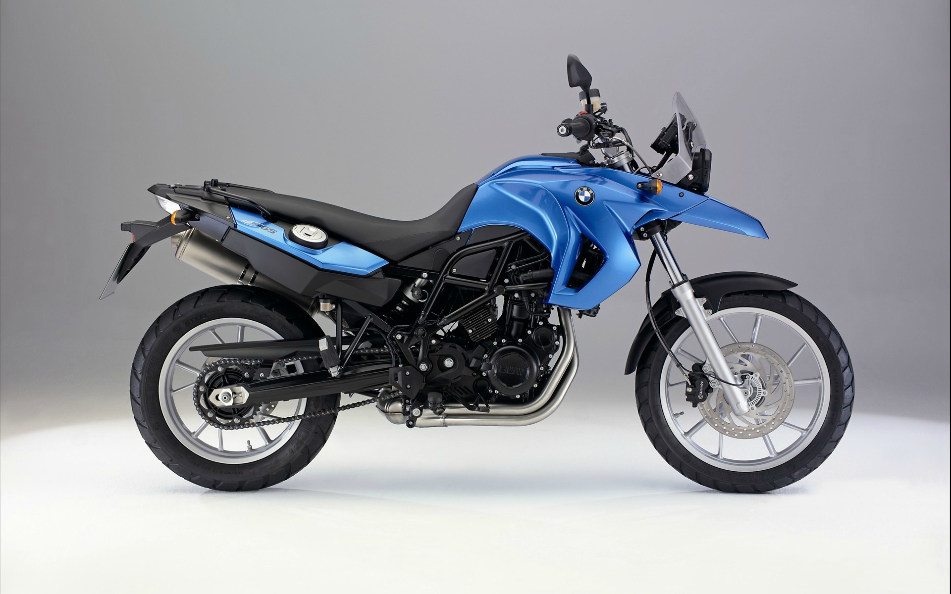 Description: A blue motorcycle is parked on a white surface with a gray background and a black seat and backrest.