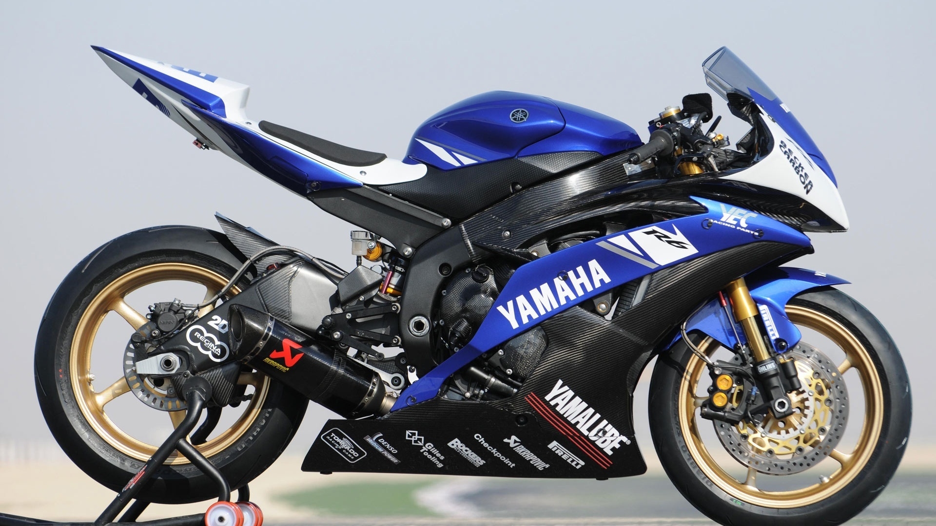 Description: A blue motorcycle parked on a track with a sky background and a person on a motorcycle behind it with a helmet on.