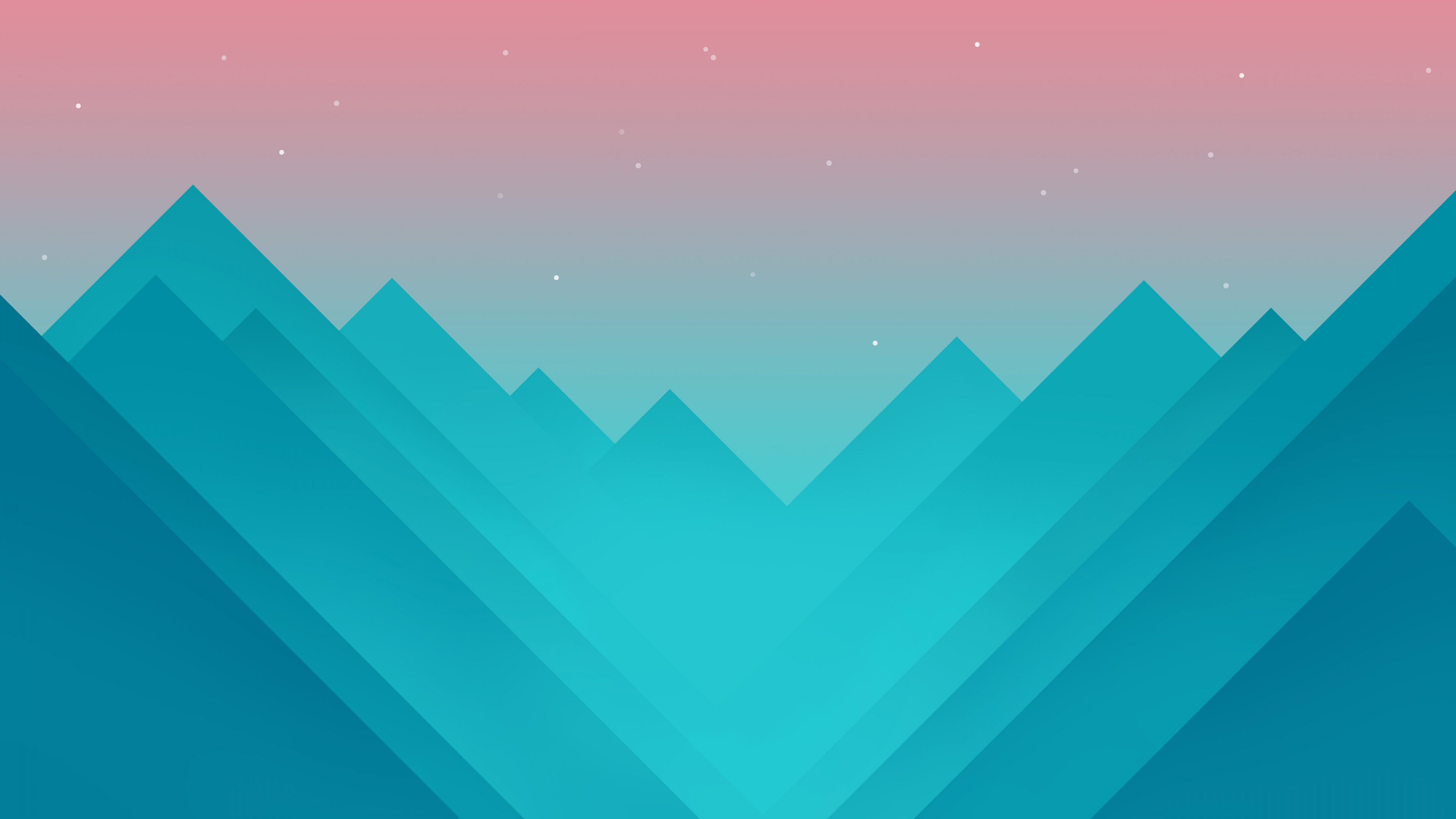 Description: A blue mountain landscape with a pink sky in the background and stars in the sky above it.