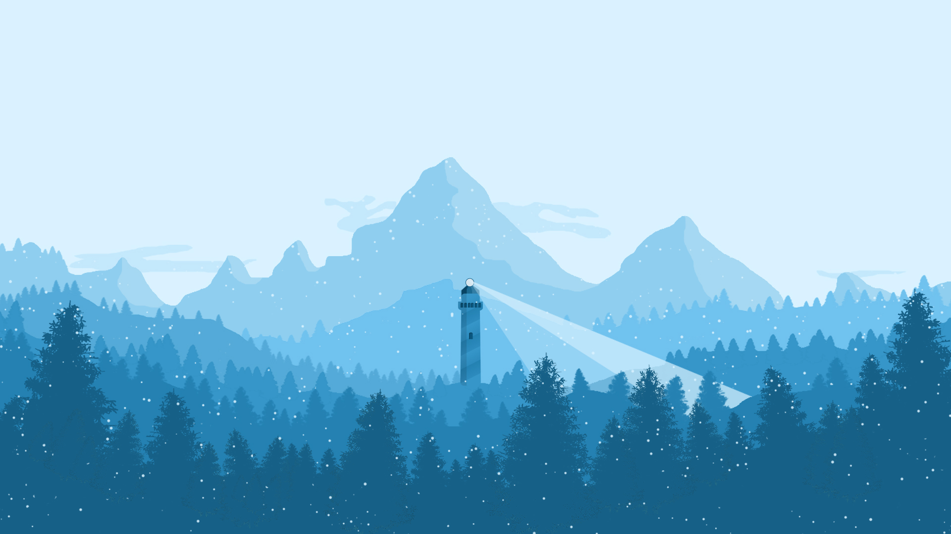 Description: A blue mountain with a light tower in the middle of it and trees around it.