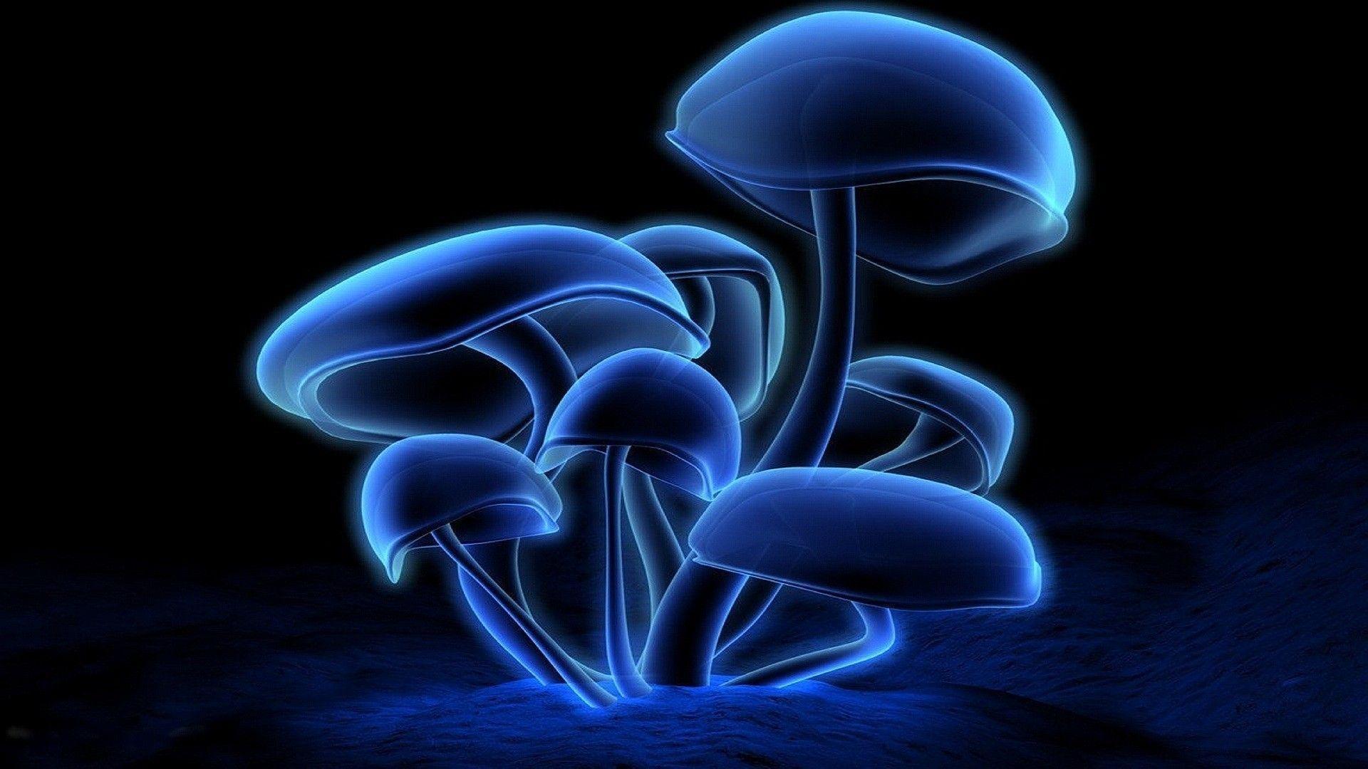 Description: A group of blue mushrooms glowing in the dark night sky with a black background and a blue glow on the ground.
