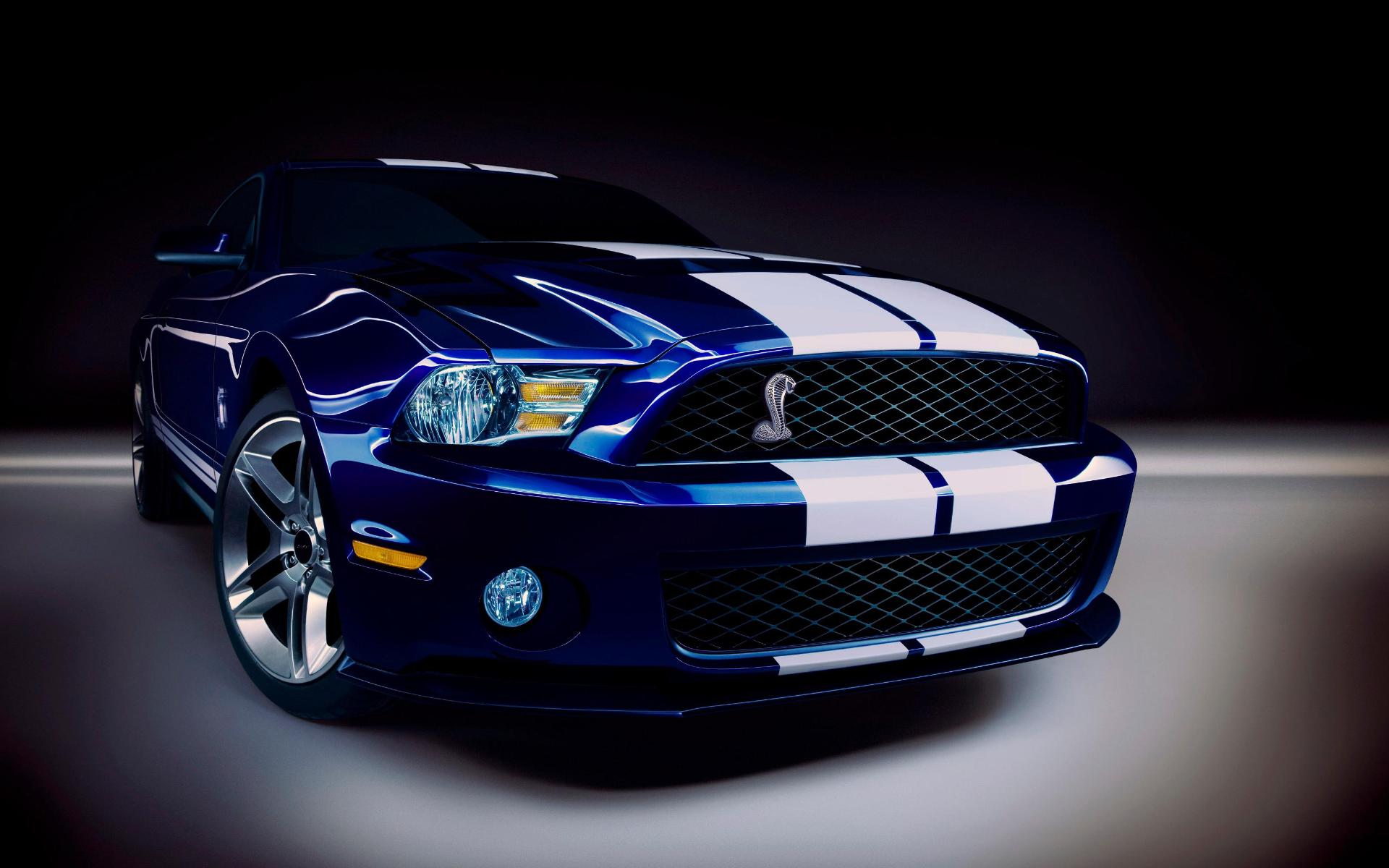 Description: A blue mustang mustang car with white stripes on it's hood and hood hood.