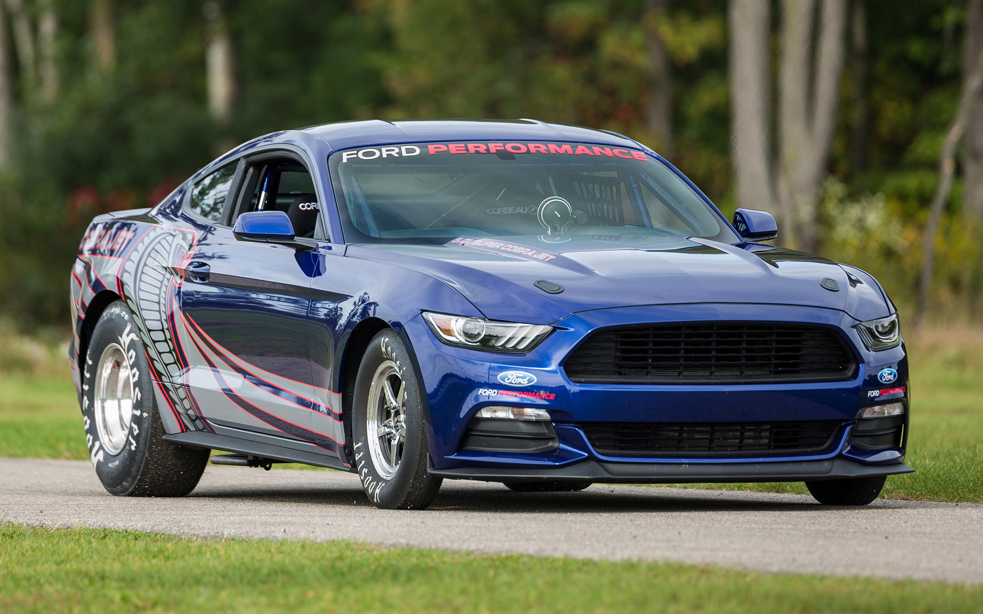 Description: A blue mustang mustang driving down a road with trees in the background and a red and white stripe on the front of the car.