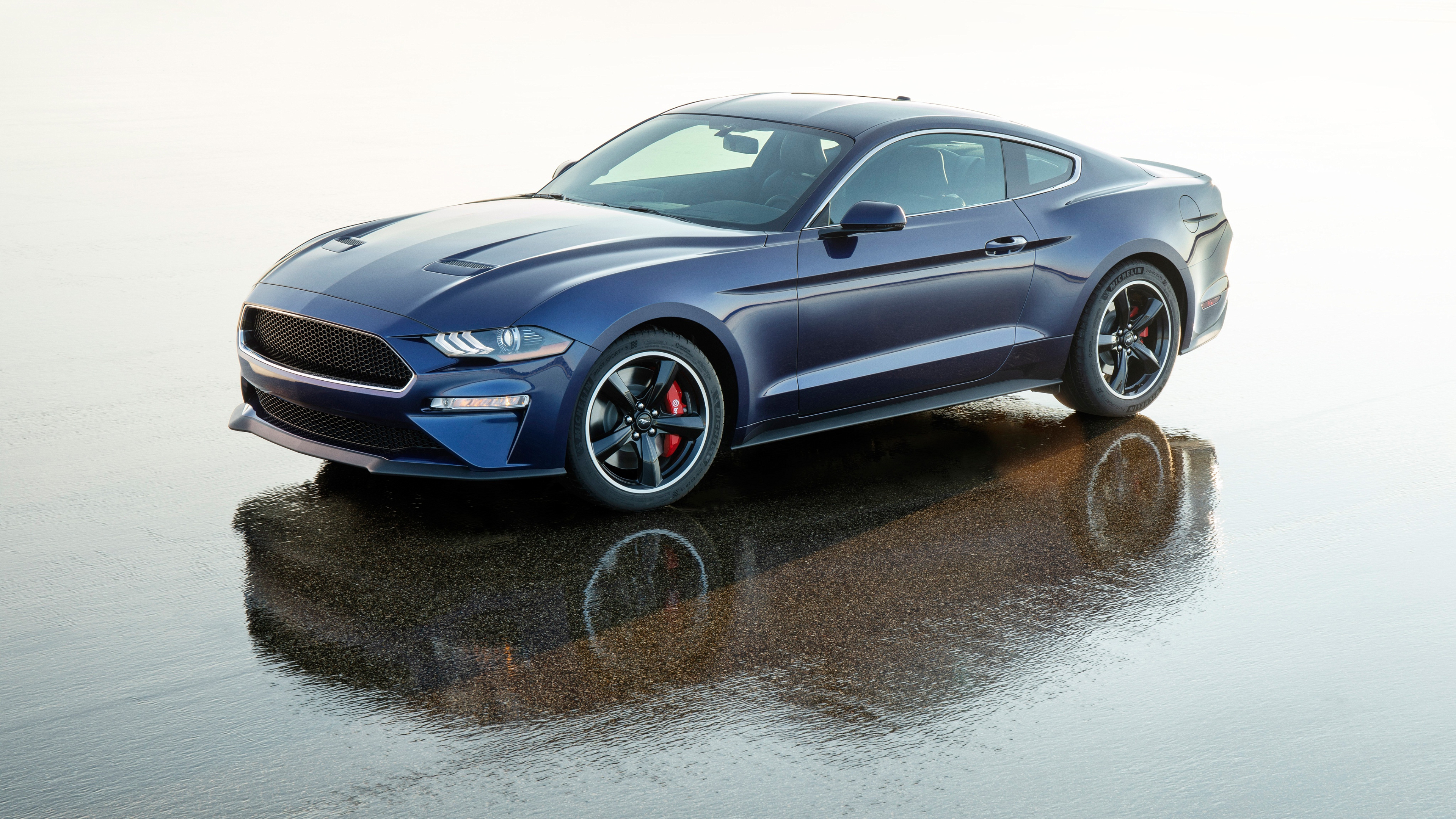 Description: A blue mustang mustang parked on a wet surface with a reflection of the car on the ground in the background.