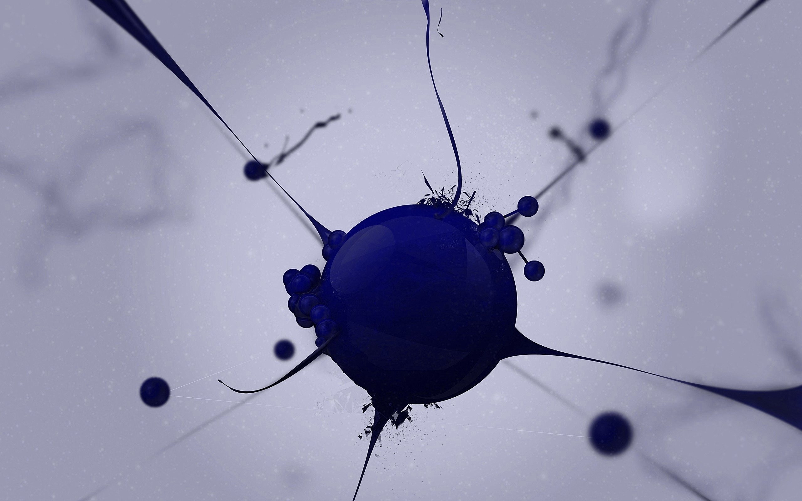 Description: A blue object with many small blue balls around it and a white background with blue dots around it and a blue circle with blue dots.
