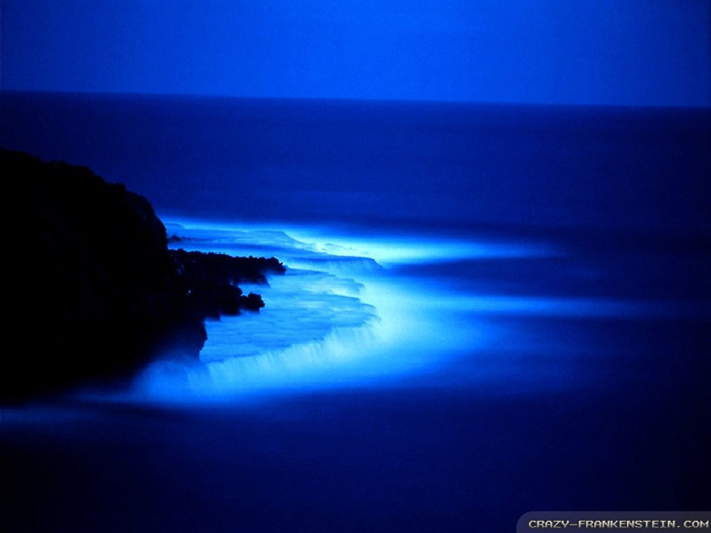 Description: A blue ocean with a cliff in the background and a blue sky above it with a few clouds in the distance.